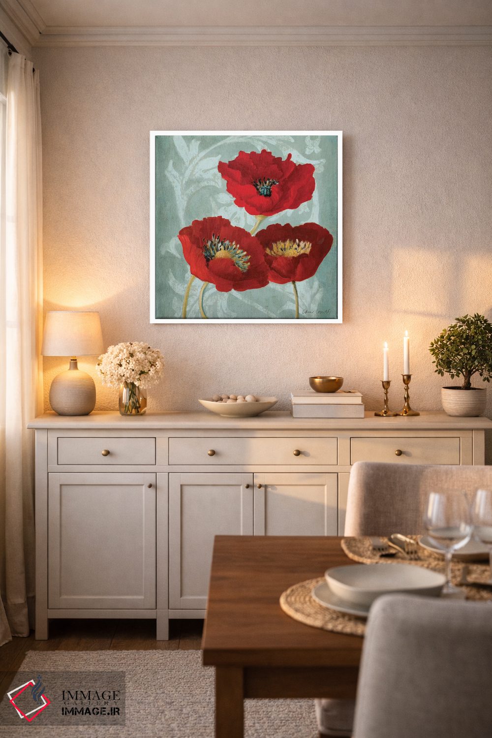 این اثر با عنوان «"شقای قرمز II"» اثرِ «لِینی لورث» حس فصل را آرام وارد فضا میکند؛ برای نشیمنهای روشن انتخابی خوشسلیقه است. فضا را شلوغ نمیکند؛ فقط لطیفترش میکند.