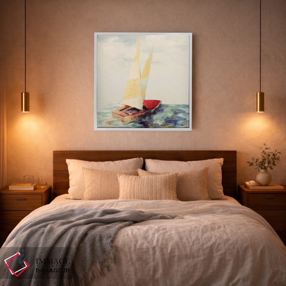 اگر چیدمانتان مینیمال است و فقط یک نقطهی رنگ میخواهید، «"قایق بادبانی قرمز وینتیج"» اثرِ «لِینی لورث» با تم این اثر گزینهی خوشسلیقهای است.