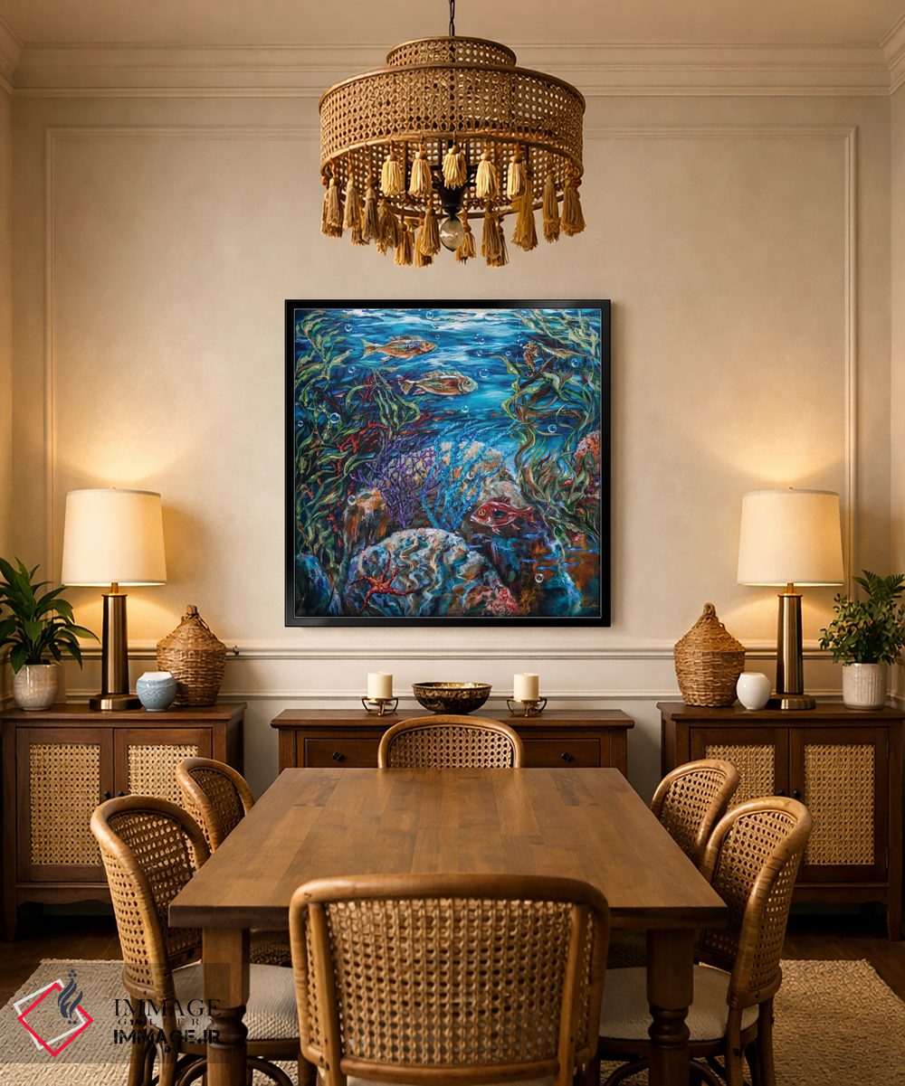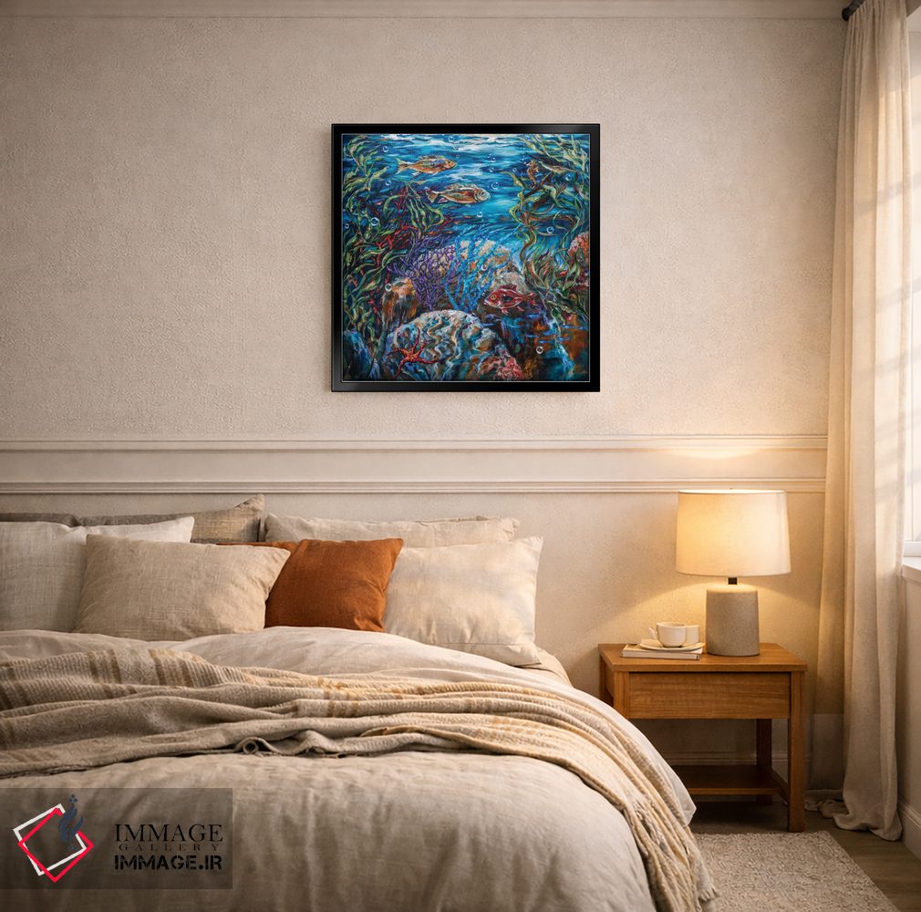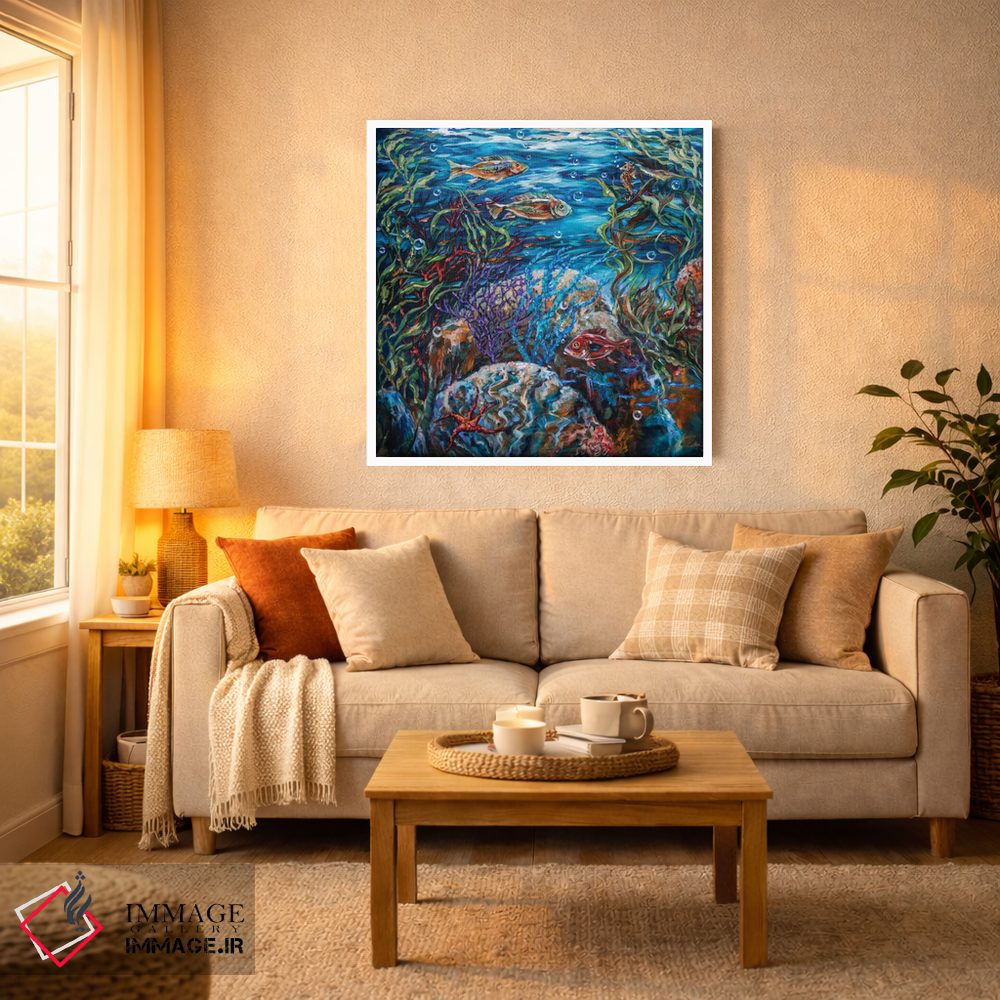 براساس پالت ترکیبی اثر، قاب تیک گرم (چوبی) پیشنهاد اول است و مشکی مات (فریم متوسط) مکمل. برای سفارشهای پروژهای با ابعاد و قابهای اختصاصی با ایماژ در تماس باشید.