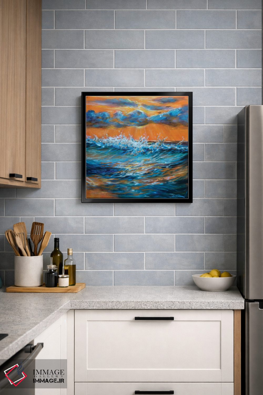 تابلو انتزاعی طلوع نارنجی اثر لیندا اولسن - نمای روبه‌رو روی دیوار