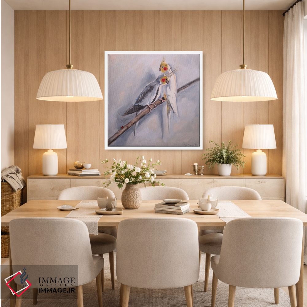 اگر میخواهید دیوار کمی سرزندگیِ محترمانه داشته باشد، «جفت دوستداشتنی طوطیهای کورلا» اثرِ «جین لانتسمن» فضا را صمیمیتر و دعوتکنندهتر نشان میدهد، برای کافههای کوچک و صمیمی گزینهٔ مناسبیست. اگر دنبال اثر دوستداشتنیِ «بیغلو» هستید، این یکی دقیق مینشیند.