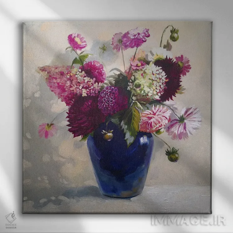 تابلو دکوراتیو دسته گل در گلدان آبی اثر جین لانتسمن