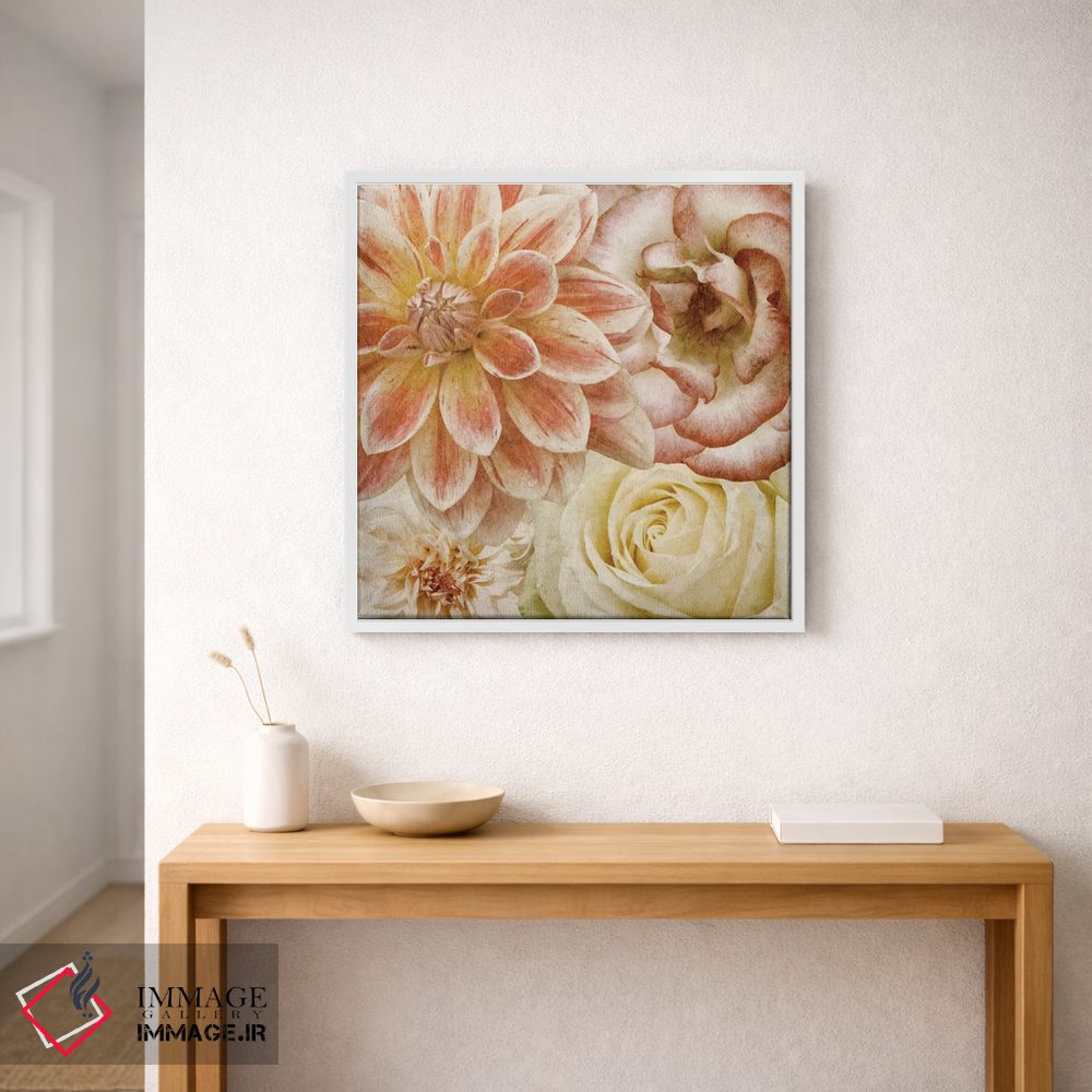 براساس پالت گرم اثر، قاب بلوط روشن (چوبی) پیشنهاد اول است و استخوانی ملایم مکمل. برای سفارشهای پروژهای با ابعاد و قابهای اختصاصی با ایماژ در تماس باشید.