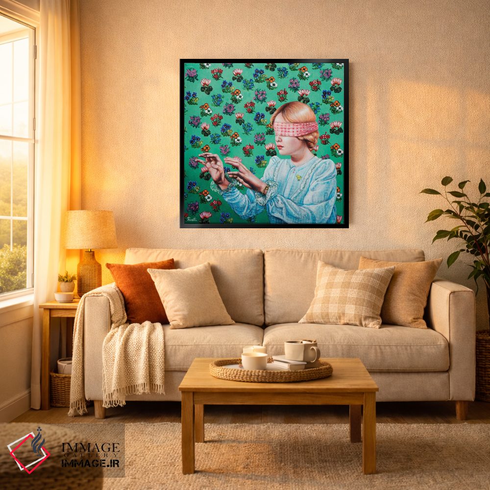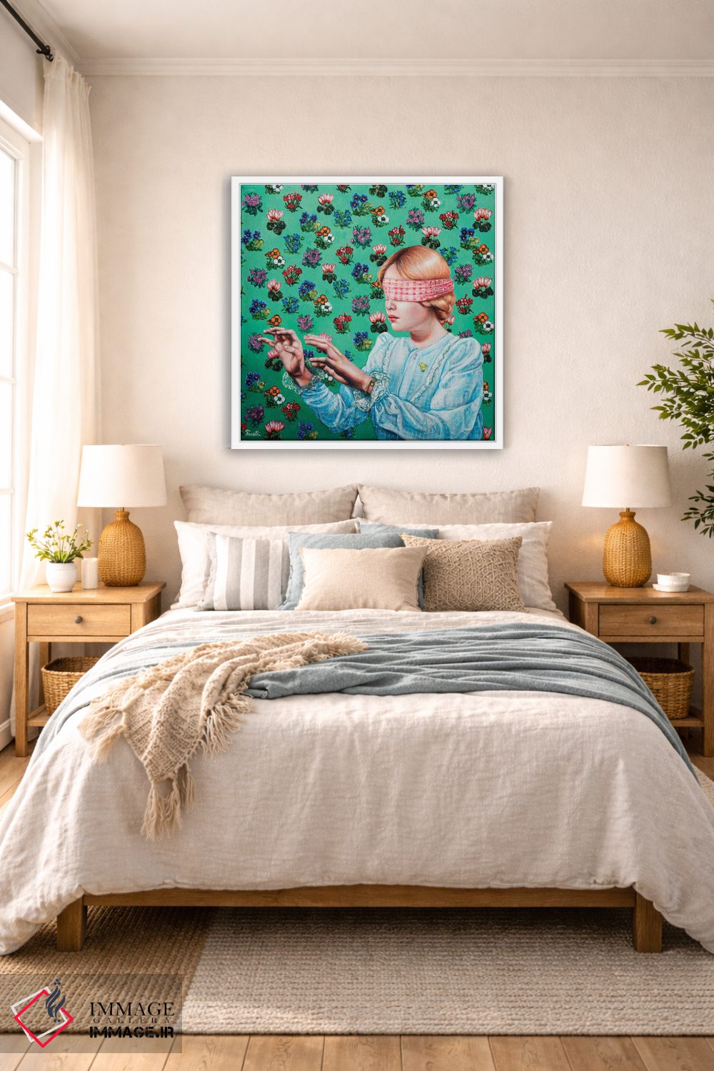 اگر دوست دارید هماهنگی کاملتر شود، رنگِ فیروزهای را در قابهای کوچک کناری کم و دقیق اضافه کنید تا نگاه به سمت اثر هدایت شود.