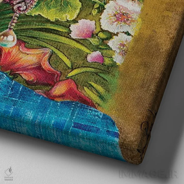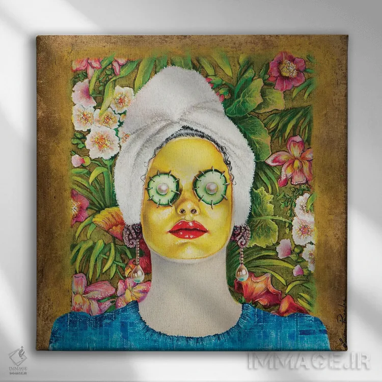 تابلو دکوراتیو دختری با ماسک طلایی صورت اثر لیوا پاکالنه فانلی - نمای نزدیک بافت بوم