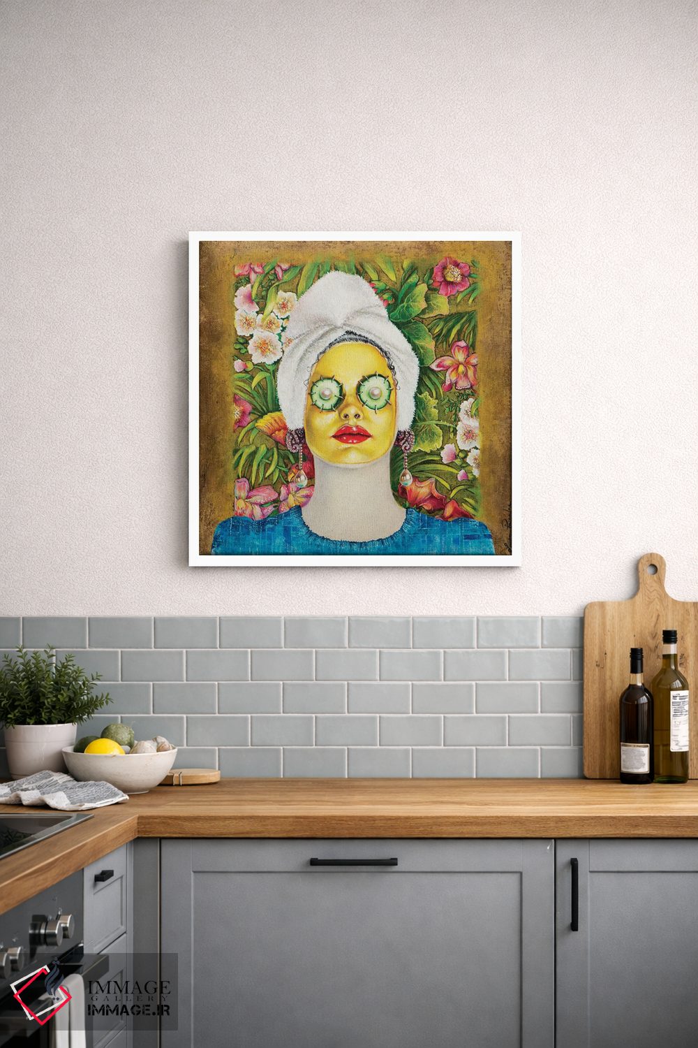 تابلو دکوراتیو دختری با ماسک طلایی صورت اثر لیوا پاکالنه فانلی - نمای روبه‌رو روی دیوار