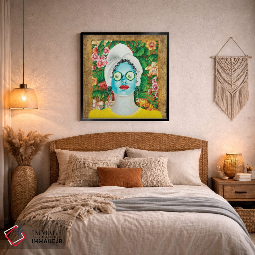 «دختری با ماسک فیروزهای صورت» اثرِ «لیوا پاکالنه فانلی» بهخاطر ساختار گرافیکیاش، کنار رنگهای خنثی و دکور صنعتی هم خوب جلوه میکند.
