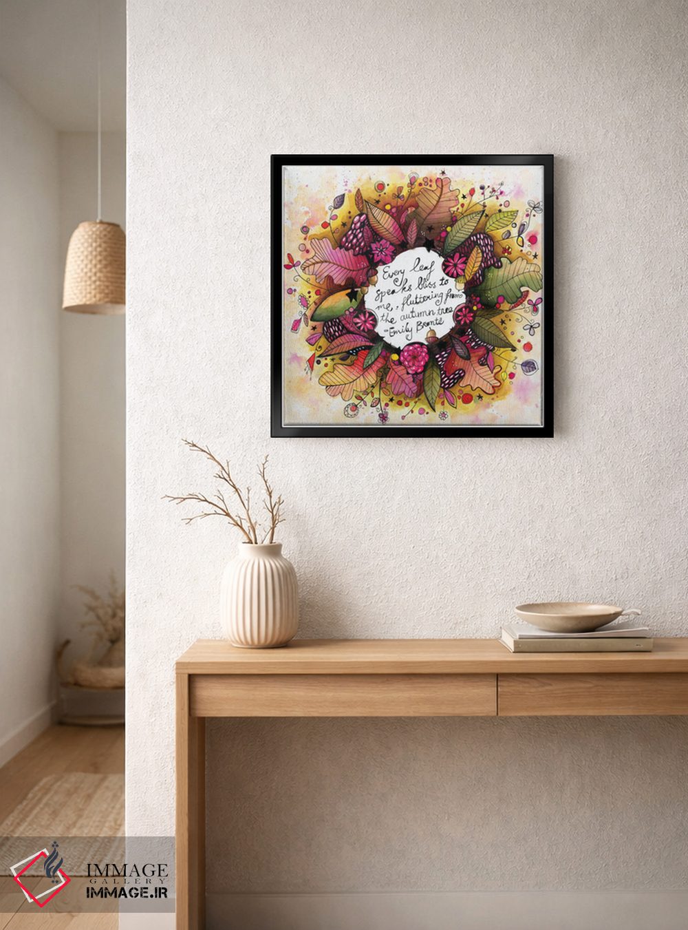 تابلو دکوراتیو حلقه گل پاییزی جدید با نقل قول اثر تامارا لاپورت - نمای روبه‌رو روی دیوار