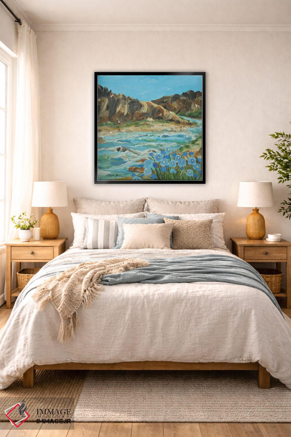براساس پالت ترکیبی اثر، قاب بلوط روشن (چوبی) پیشنهاد اول است و استخوانی ملایم مکمل. برای سفارشهای پروژهای با ابعاد و قابهای اختصاصی با ایماژ در تماس باشید.