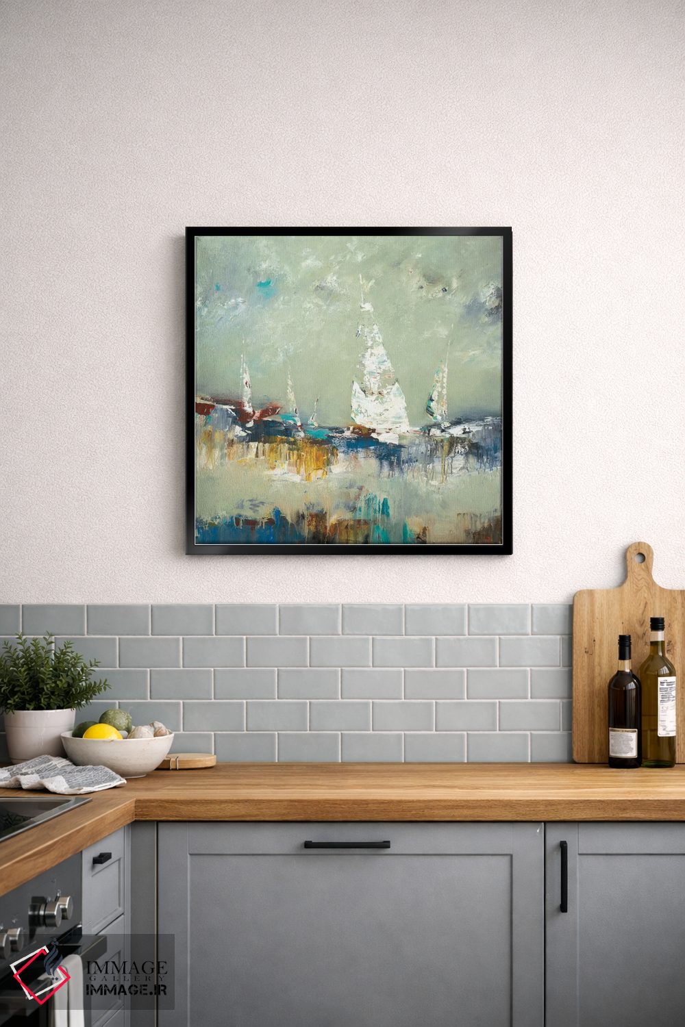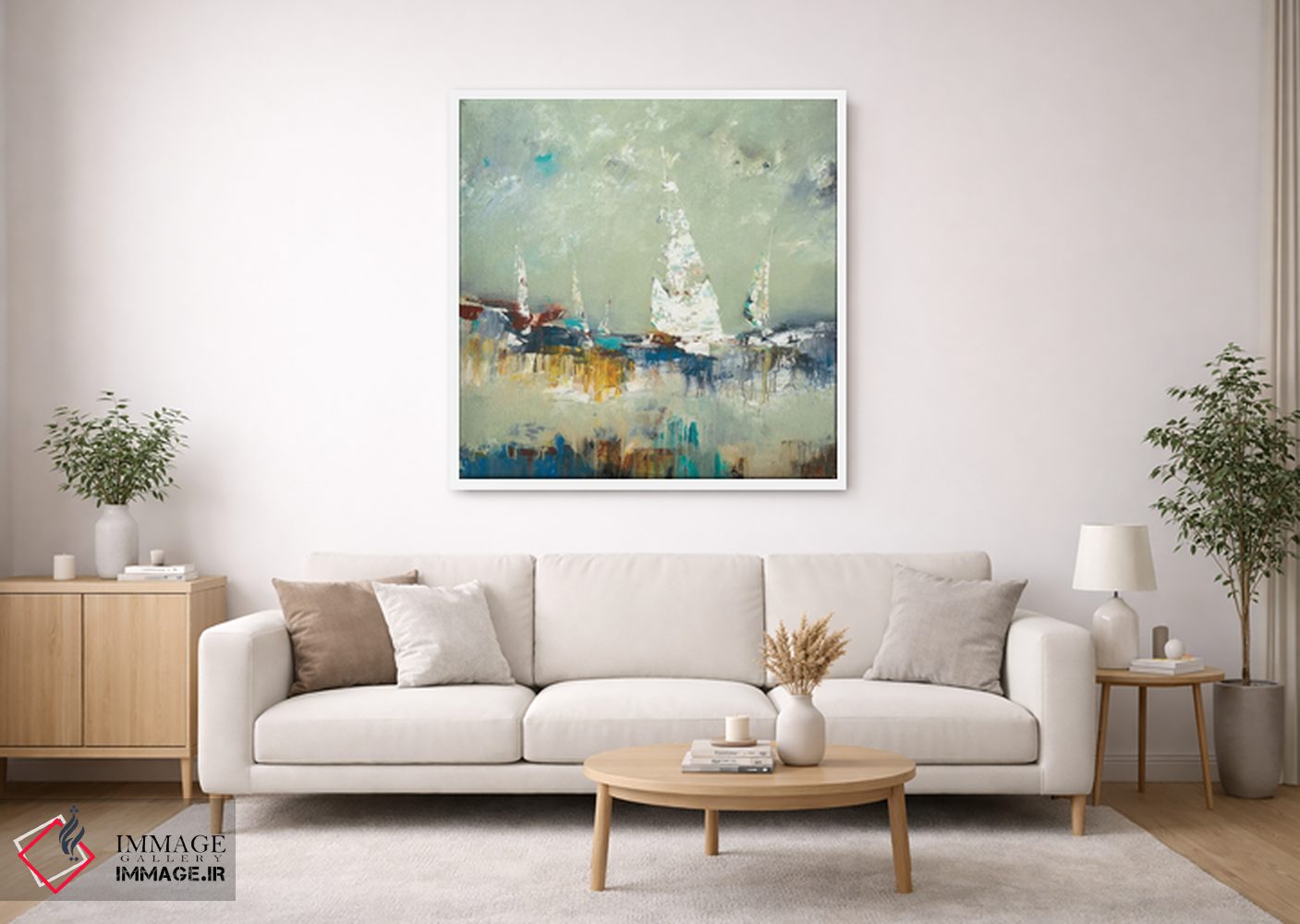 براساس پالت ترکیبی اثر، قاب بلوط روشن (چوبی) پیشنهاد اول است و استخوانی ملایم مکمل. برای سفارشهای پروژهای با ابعاد و قابهای اختصاصی با ایماژ در تماس باشید.