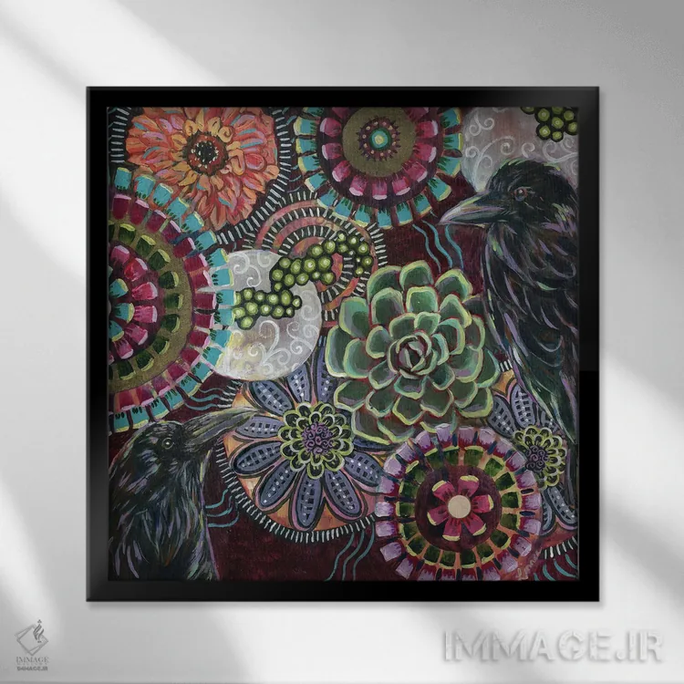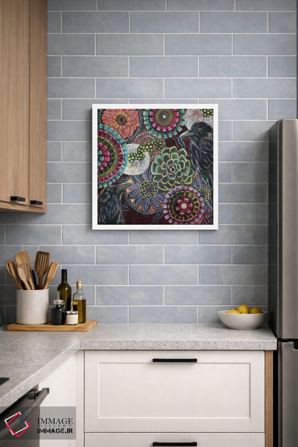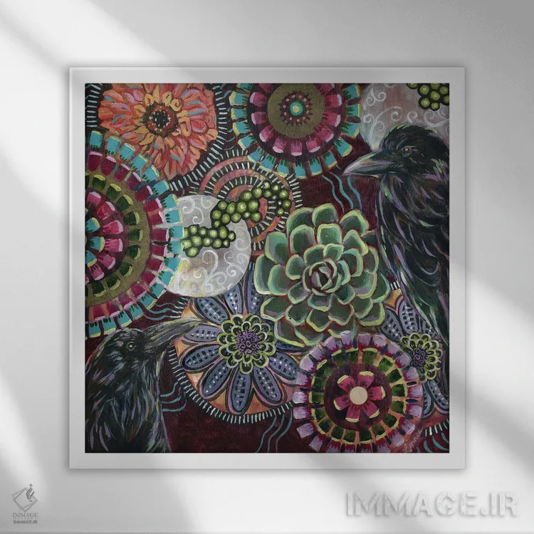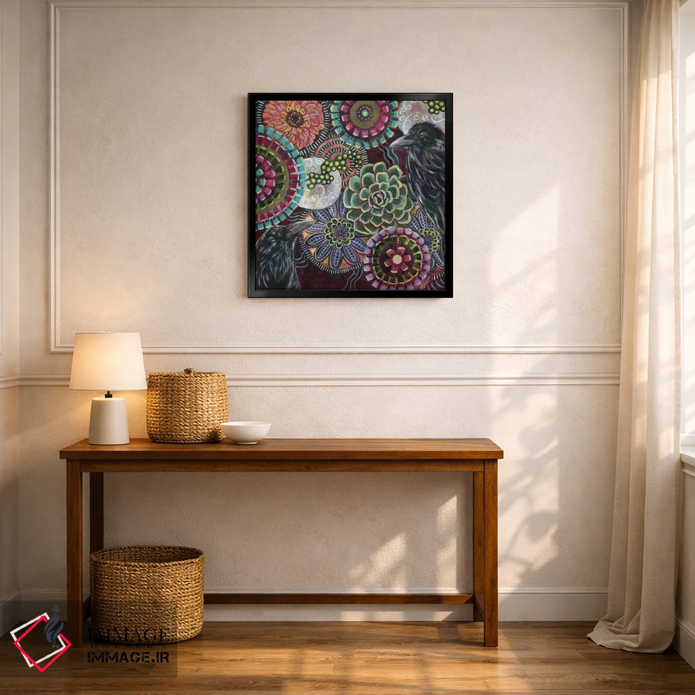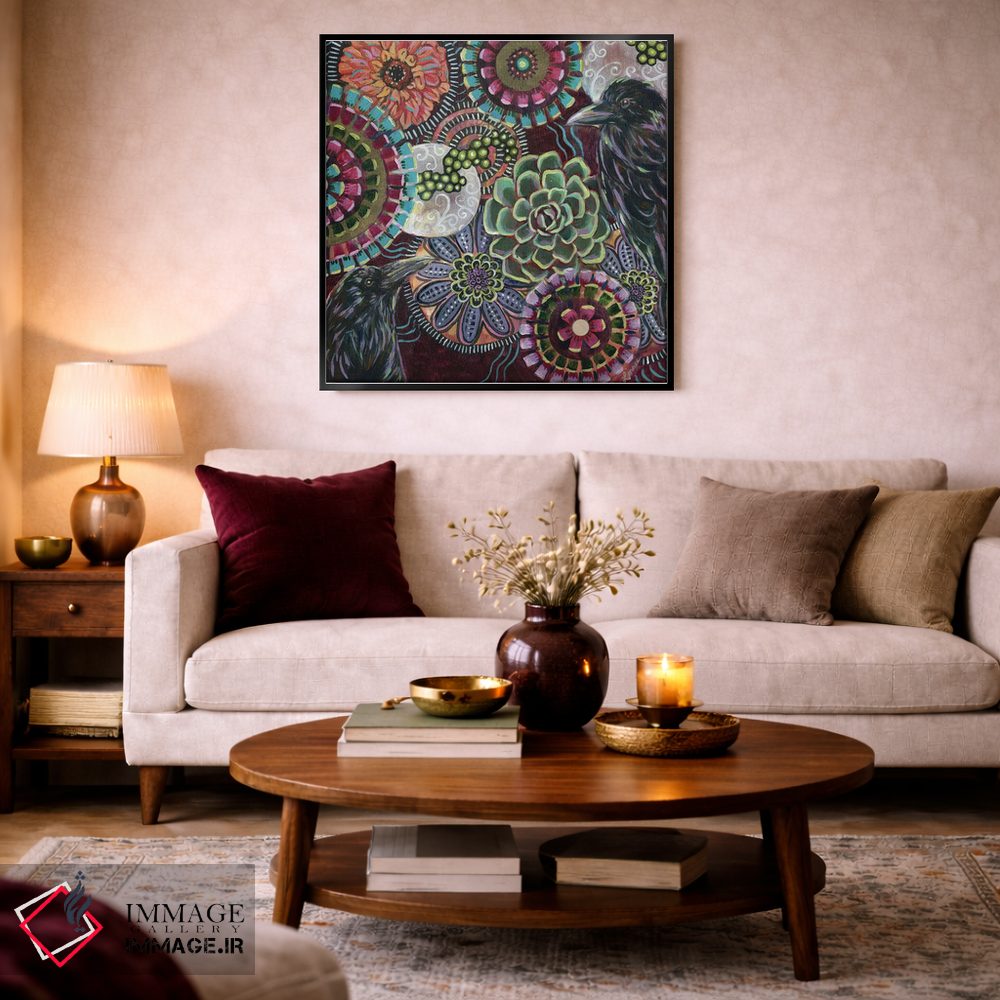 براساس پالت ترکیبی اثر، قاب تیک گرم (چوبی) پیشنهاد اول است و مشکی مات (فریم متوسط) مکمل. برای سفارشهای پروژهای با ابعاد و قابهای اختصاصی با ایماژ در تماس باشید.