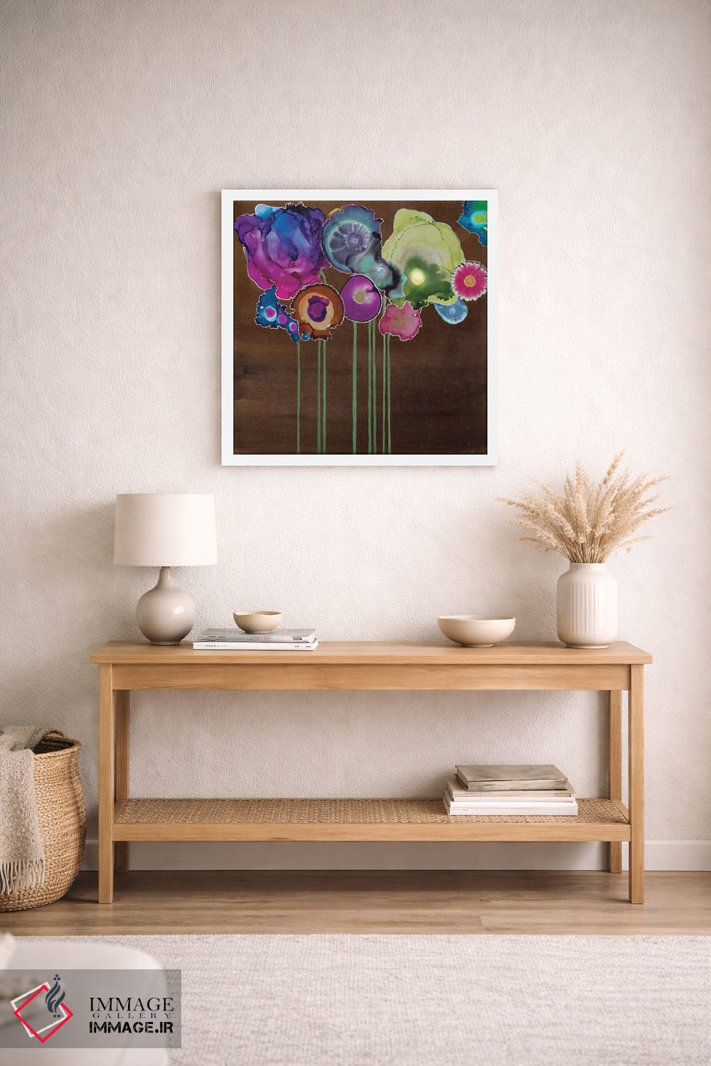 تابلو انتزاعی دسته گل بهاری دو اثر لورا ون هورن - نمای روبه‌رو روی دیوار