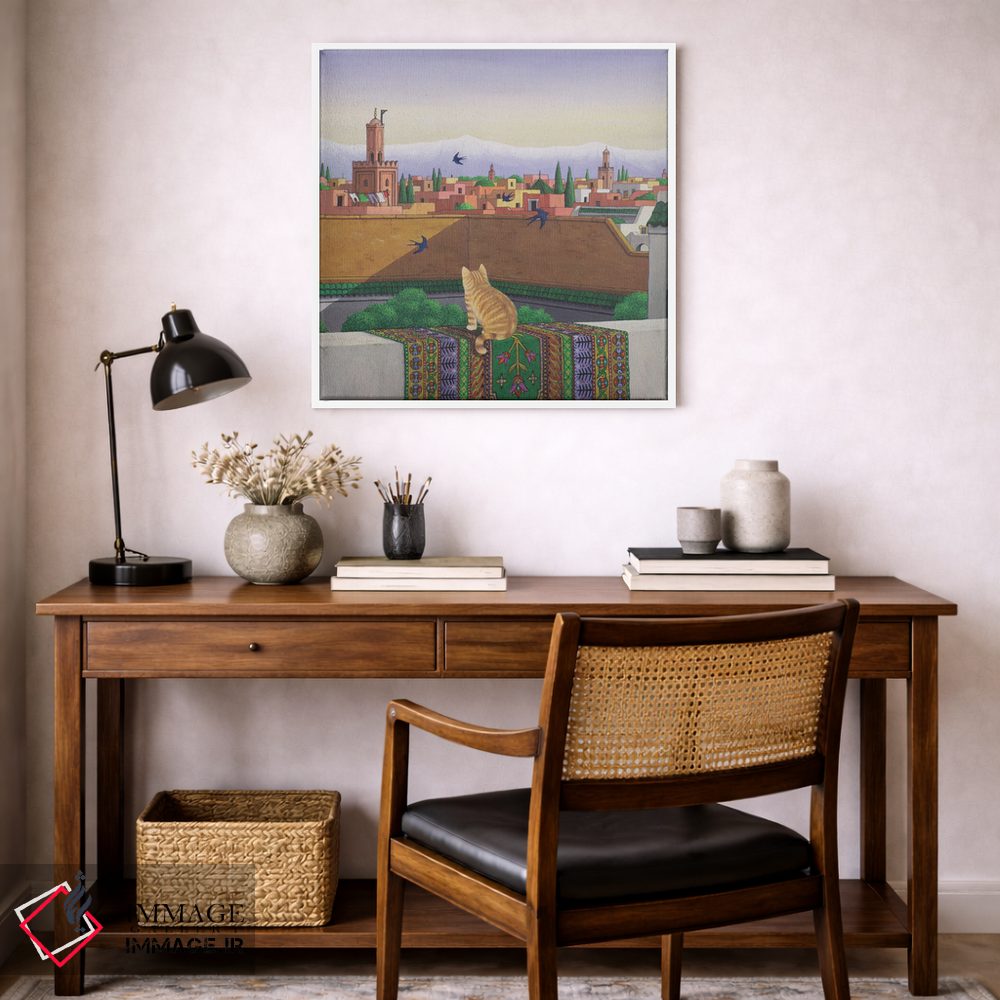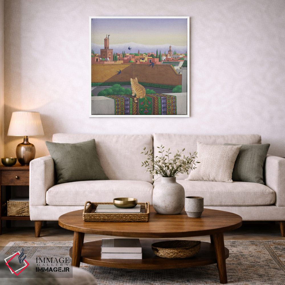 براساس پالت ترکیبی اثر، قاب تیک گرم (چوبی) پیشنهاد اول است و مشکی مات (فریم متوسط) مکمل. برای سفارشهای پروژهای با ابعاد و قابهای اختصاصی با ایماژ در تماس باشید.