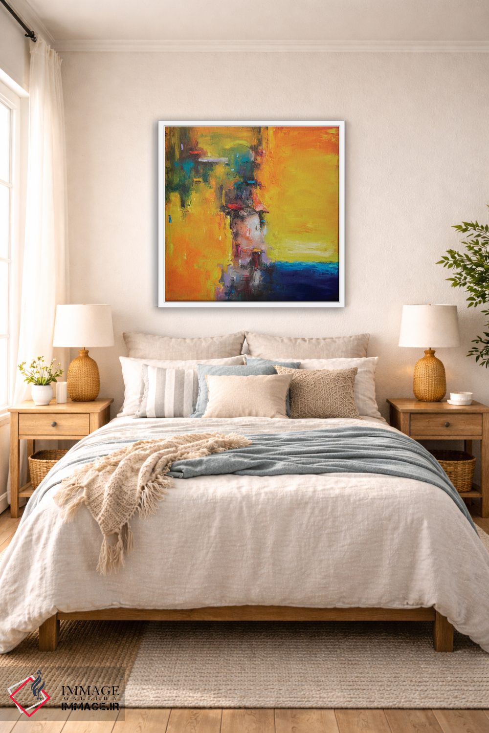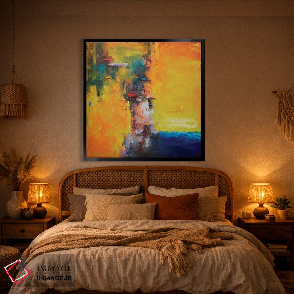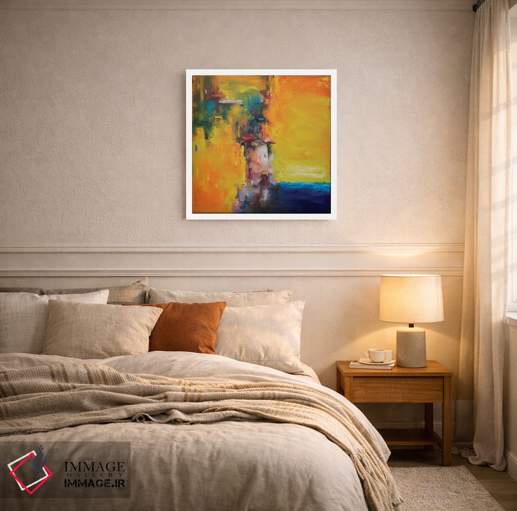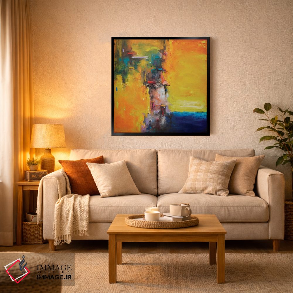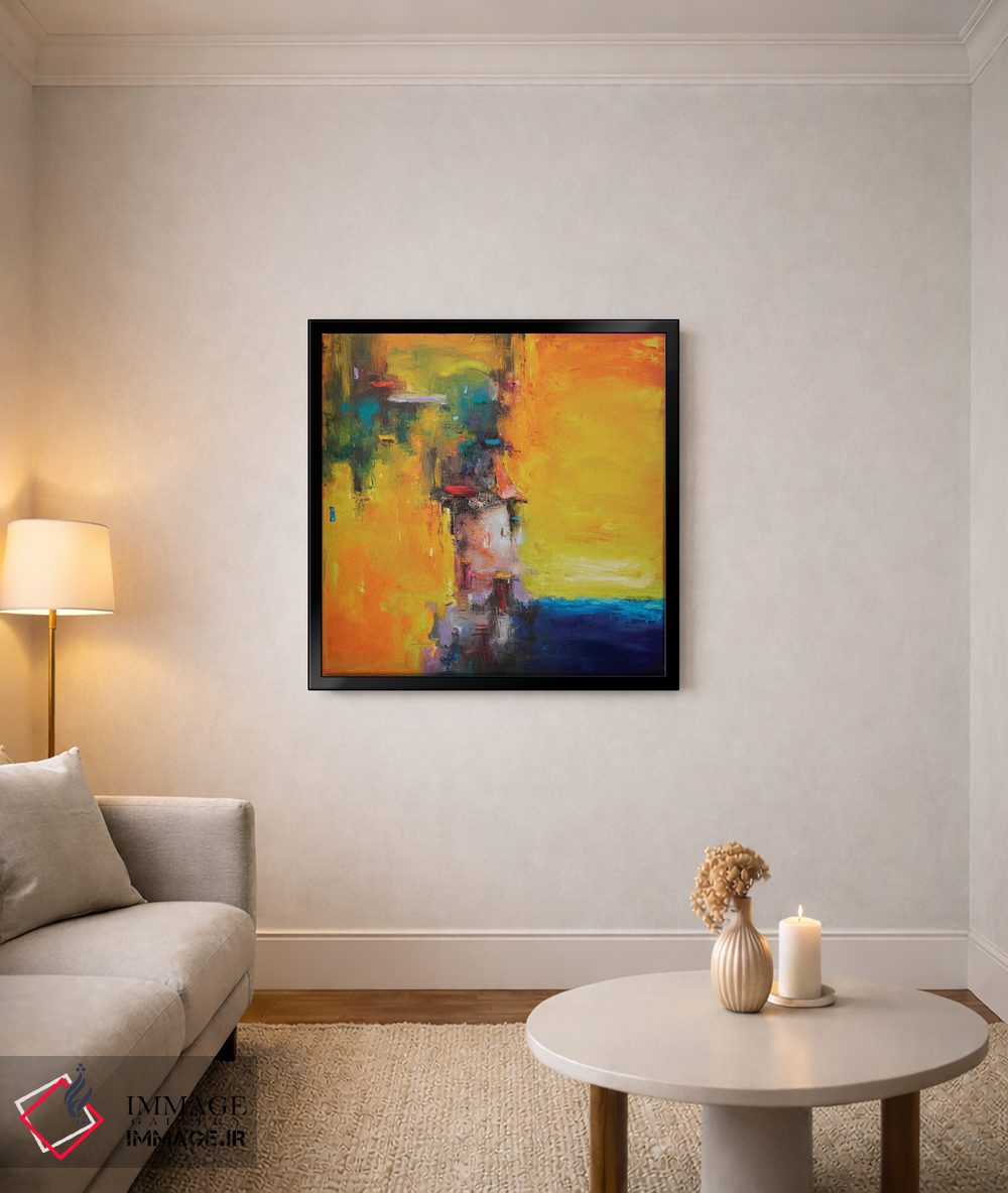 براساس پالت ترکیبی اثر، قاب تیک گرم (چوبی) پیشنهاد اول است و مشکی مات (فریم متوسط) مکمل. برای سفارشهای پروژهای با ابعاد و قابهای اختصاصی با ایماژ در تماس باشید.