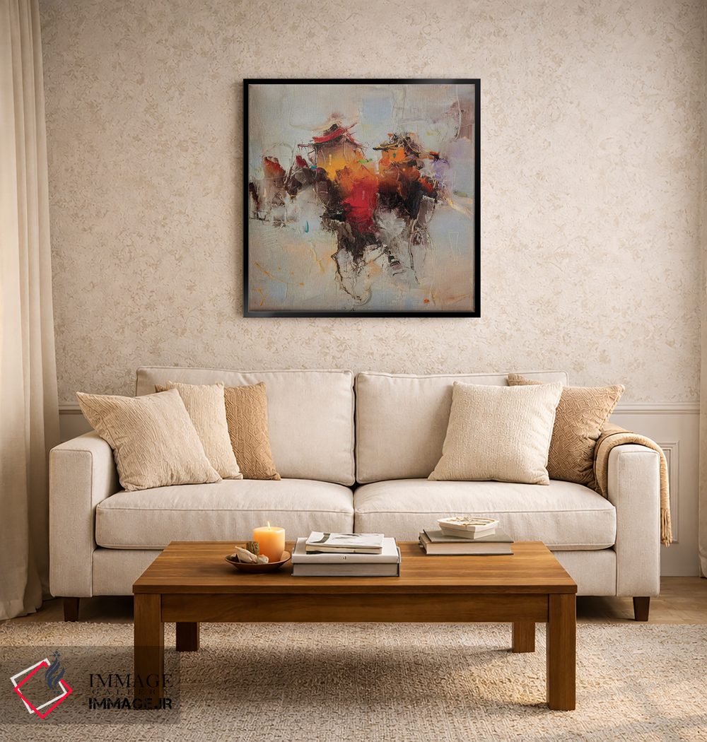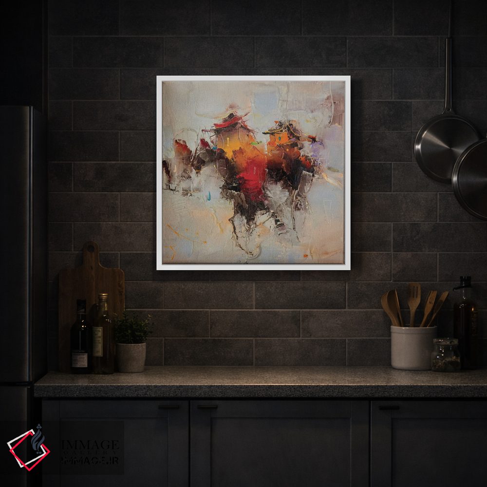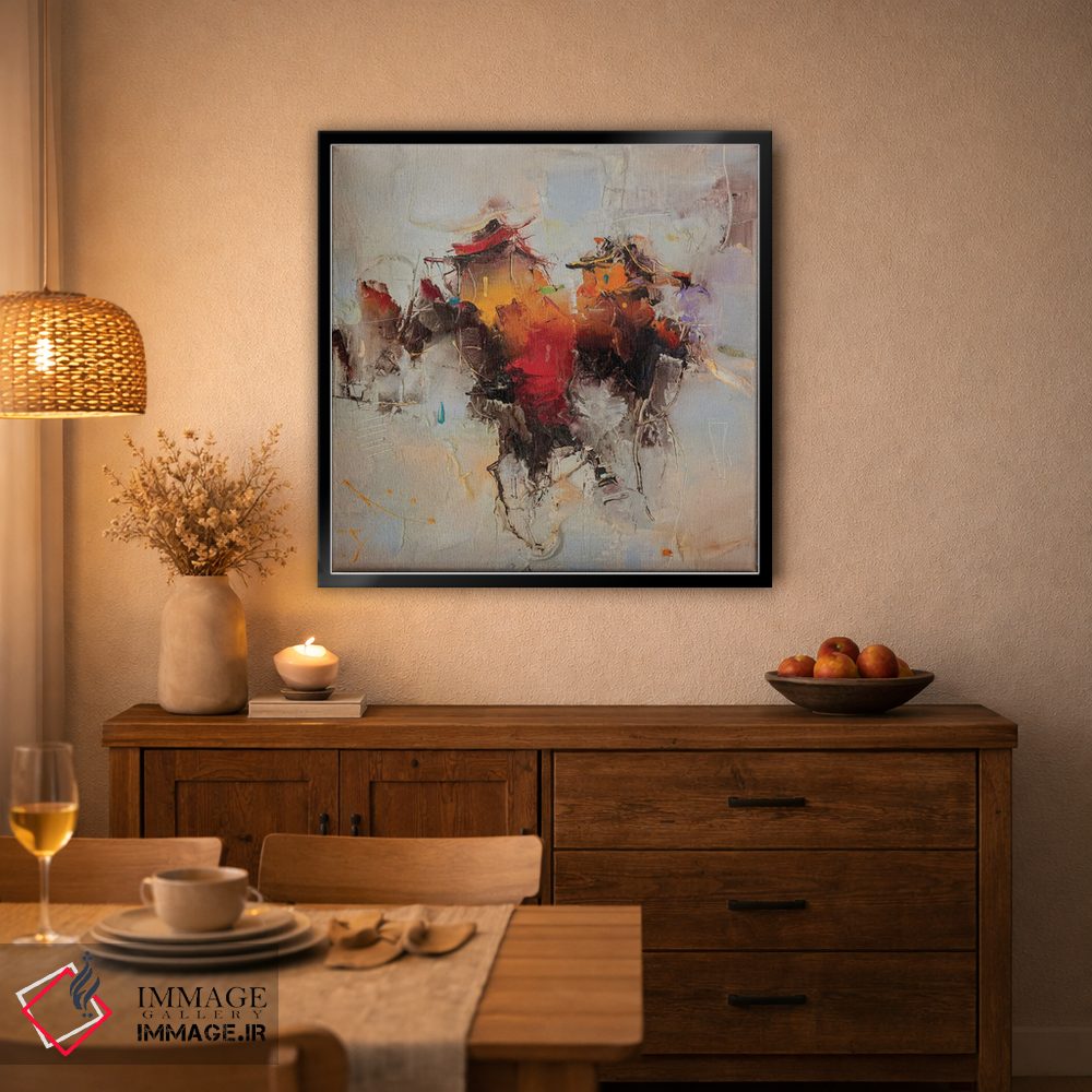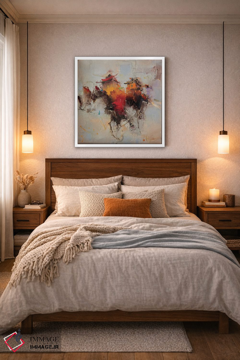 براساس پالت گرم اثر، قاب بلوط روشن (چوبی) پیشنهاد اول است و استخوانی ملایم مکمل. برای سفارشهای پروژهای با ابعاد و قابهای اختصاصی با ایماژ در تماس باشید.