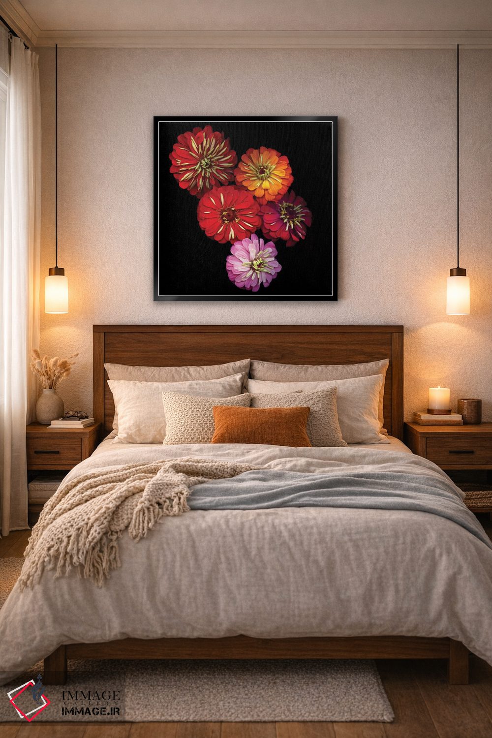 بوم گالری ایماژ طوری طراحی شده که اثر روی دیوار «پرداختشده» و حرفهای دیده شود—نه پرزرقوبرقِ بیپایه؛ بلکه دقیق و خوشپرداخت. بافت ظریف کنواس کمک میکند حس اثر هنری را در نگاه نزدیک نگه میدارد و همین «پرداخت» تفاوت را میسازد. در ارائهی آماده نصب، برای یک ارائهی حرفهای ضروری است و در دکورهای مدرن و مینیمال خیلی خوب مینشیند. حاصل کار، یک تابلو خوشنشین است که هم از دور اثرگذار است و هم از نزدیک خوشخوان؛ و اگر بخواهید، میتوان چیدمان را برای گالریوال هم پیشنهاد داد.