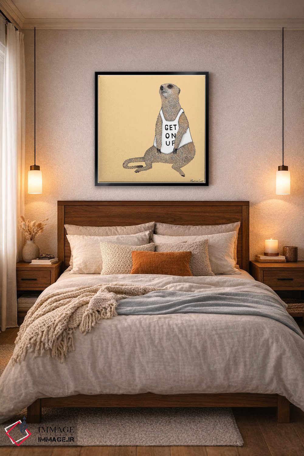 براساس پالت گرم اثر، قاب بلوط روشن (چوبی) پیشنهاد اول است و استخوانی ملایم مکمل. برای سفارشهای پروژهای با ابعاد و قابهای اختصاصی با ایماژ در تماس باشید.