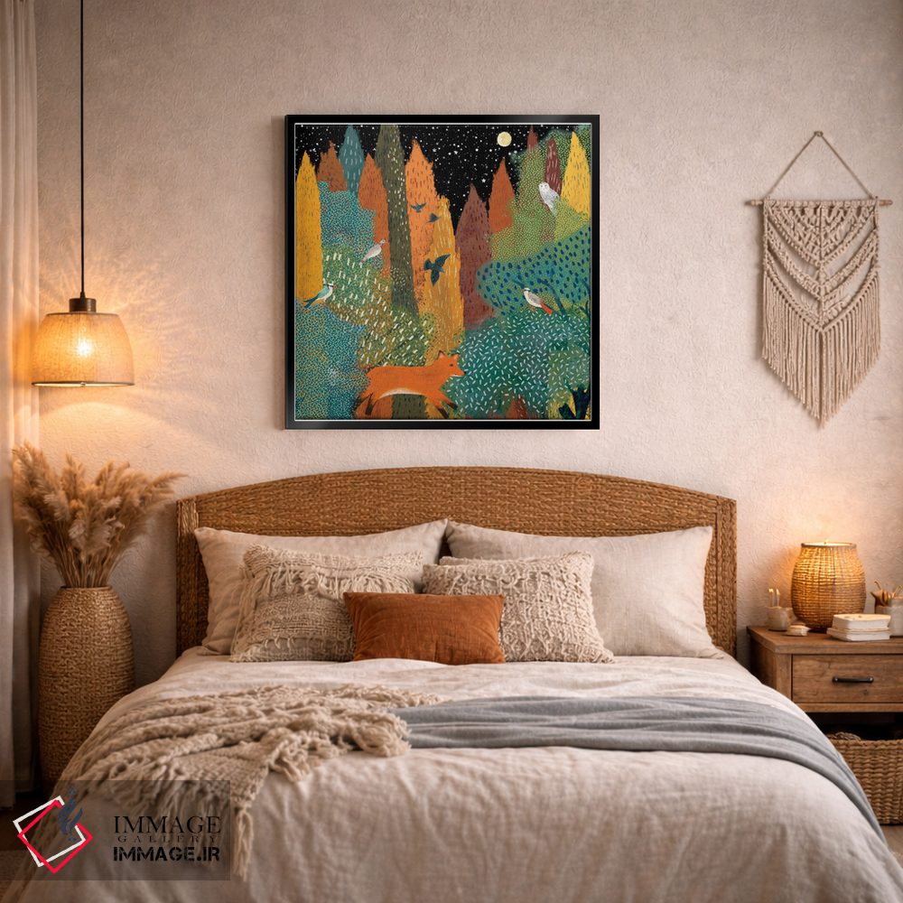 اگر به دکورهای طبیعی علاقه دارید، «بین درختان سرو» اثرِ «میشل کمپل» حس فصل را آرام وارد فضا میکند، برای فضای غذاخوری گزینهٔ مناسبیست. با قاب روشن یا چوبی، حس طبیعیتری پیدا میکند.