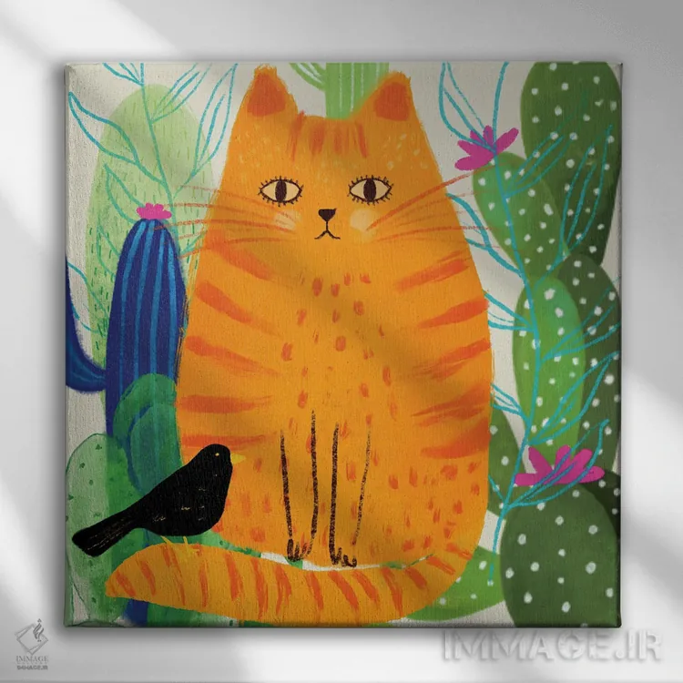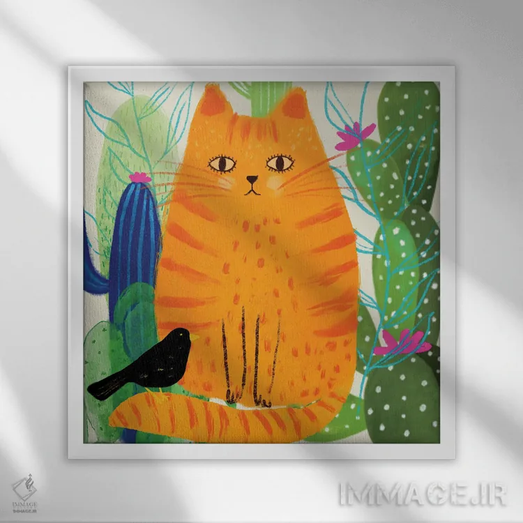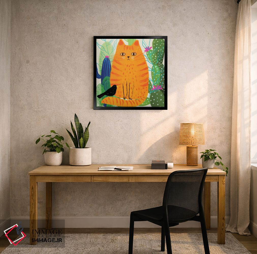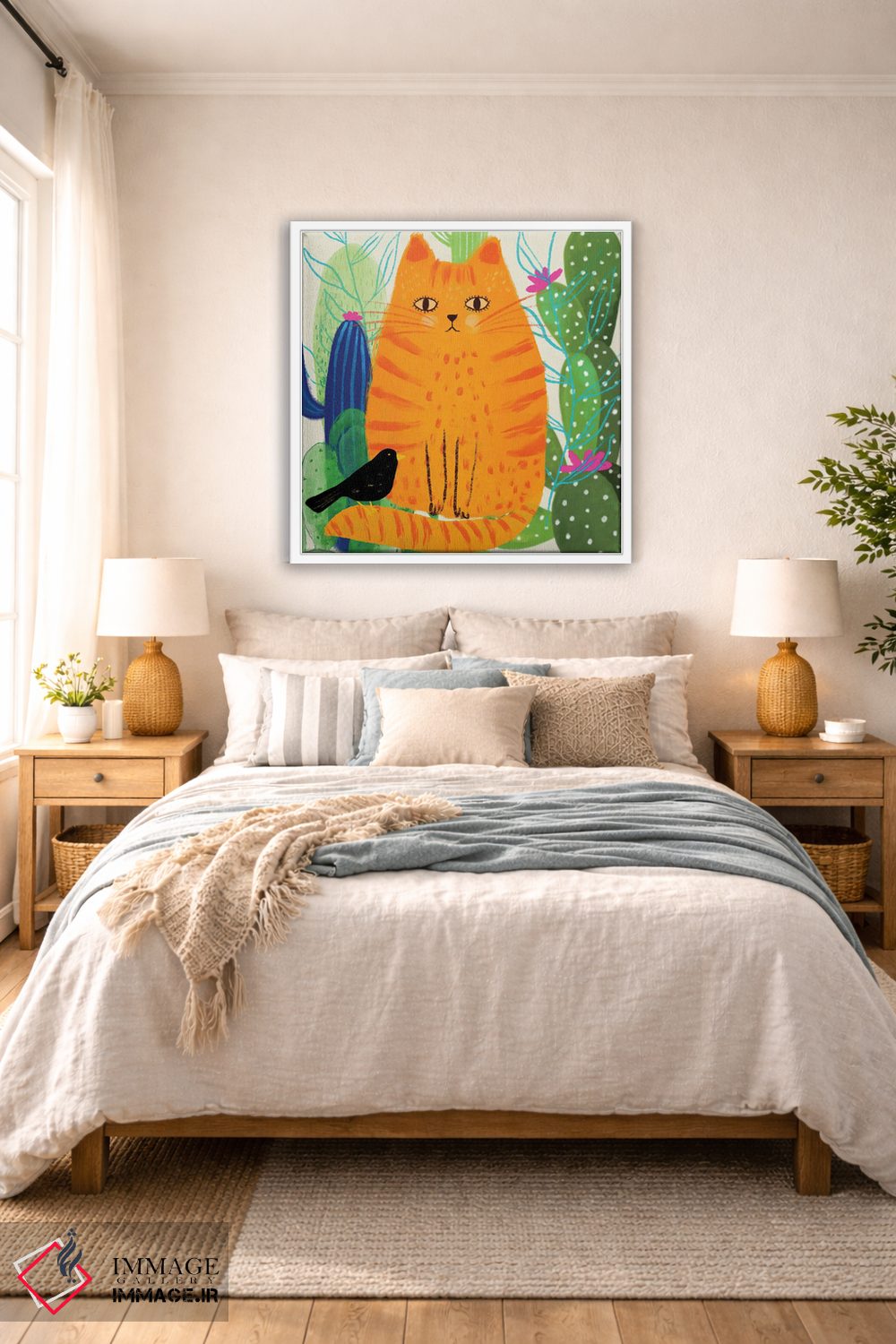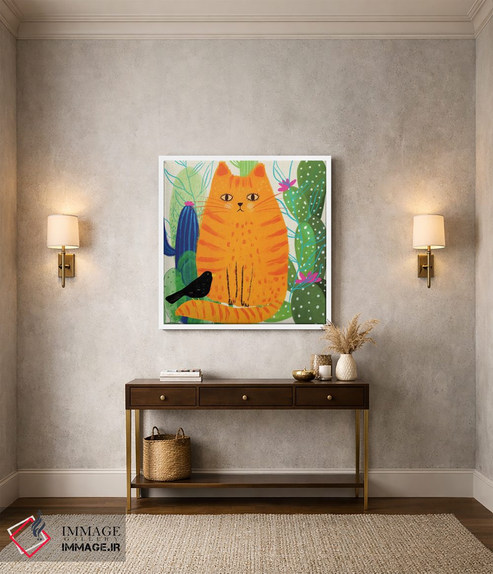 برای دیوارهای ساده، «گربه زنجبیلی نارنجی رنگارنگ» اثرِ «میشل کمپل» به دیوار، انرژیِ نرم و زنده میدهد؛ برای راهروها و ورودیهای گرم انتخابی خوشسلیقه است. هم فضا را گرم میکند، هم شلوغش نمیکند.