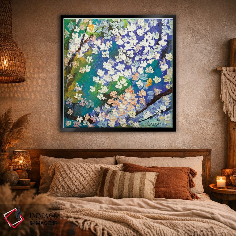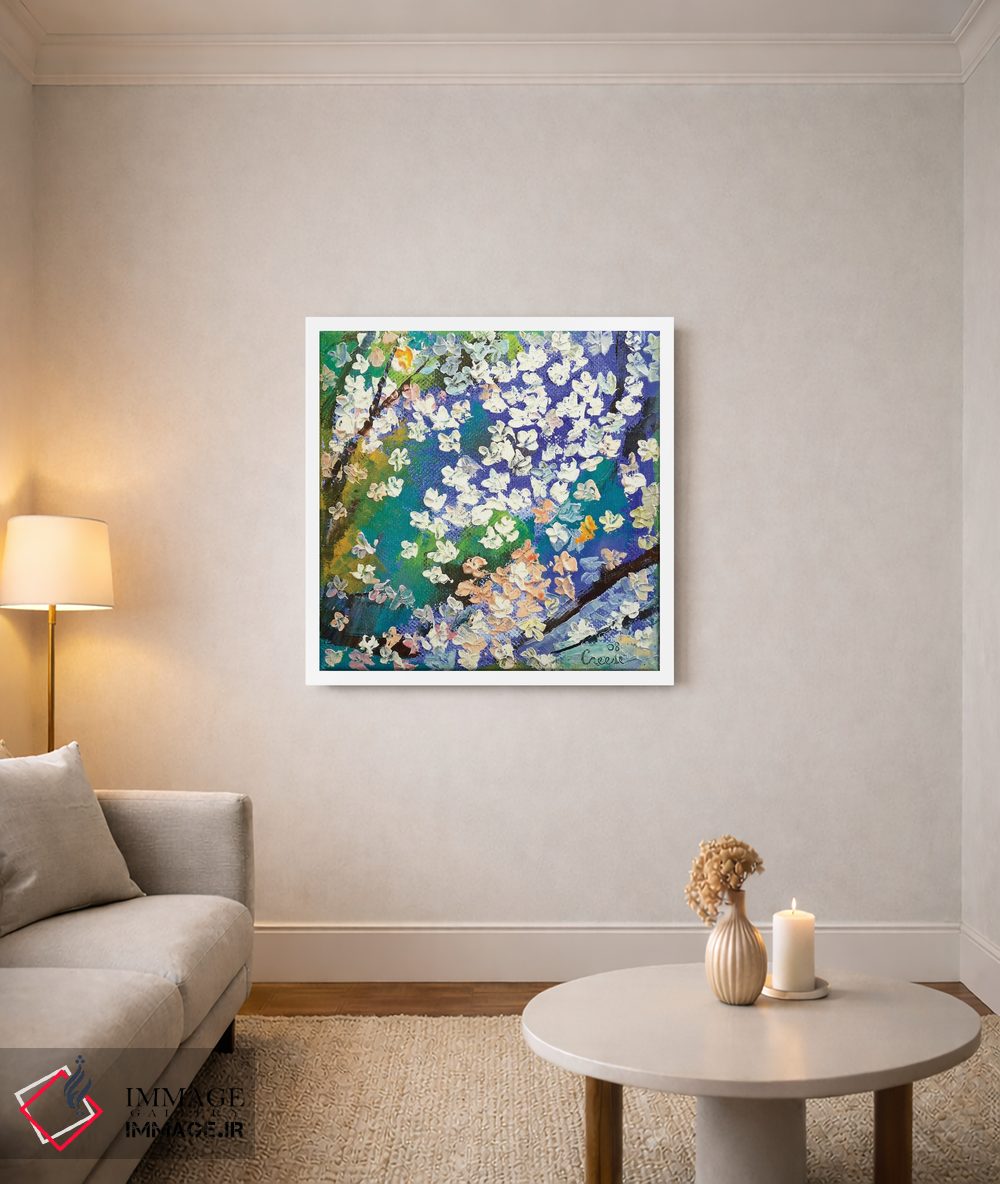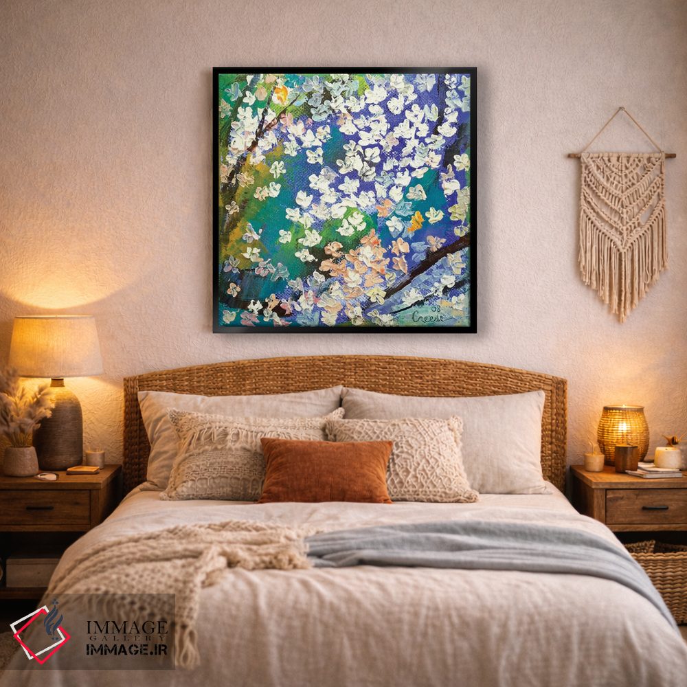 براساس پالت ترکیبی اثر، قاب تیک گرم (چوبی) پیشنهاد اول است و مشکی مات (فریم متوسط) مکمل. برای سفارشهای پروژهای با ابعاد و قابهای اختصاصی با ایماژ در تماس باشید.