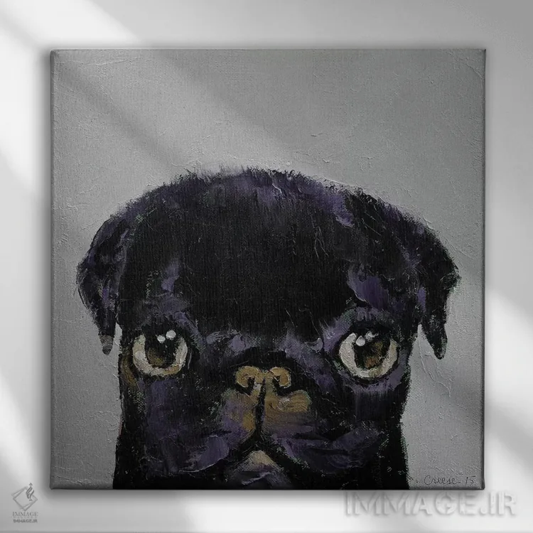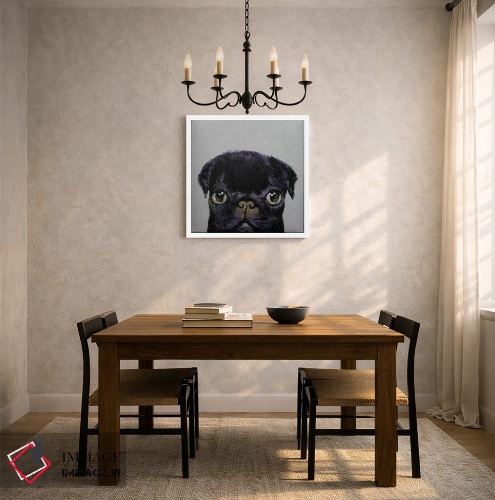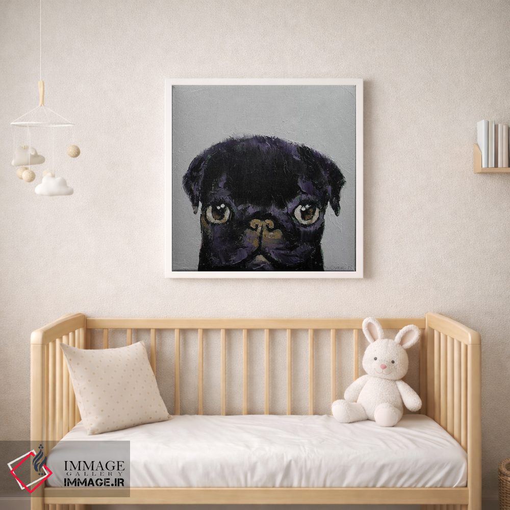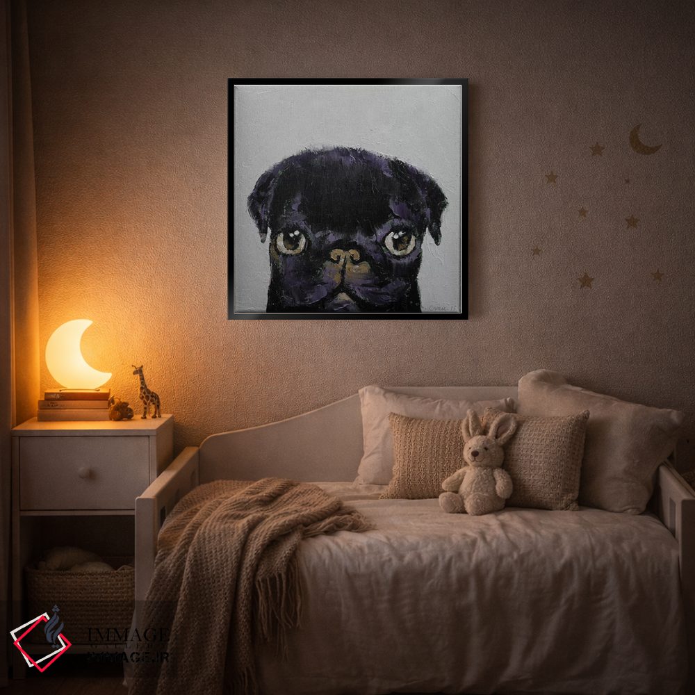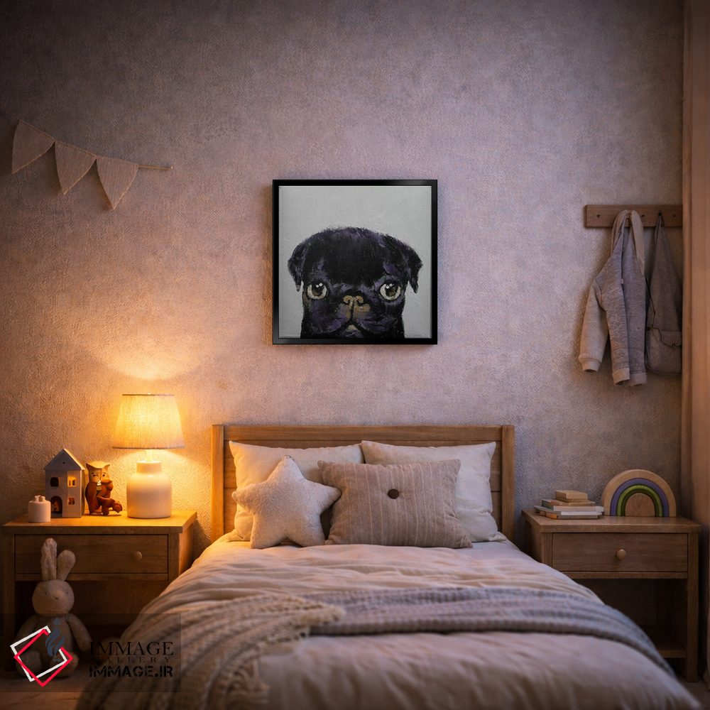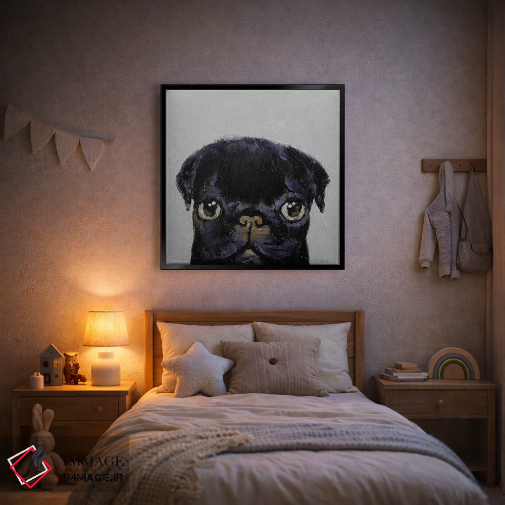 در «پاگ سیاه» اثرِ «مایکل کریس»، حضور حیوانات به فضا، گرمیِ ملایم اضافه میکند؛ برای اتاق کودک (بدون لحن کودکانه) انتخابی خوشسلیقه است. با نورپردازی نقطهای، جذابتر هم میشود.