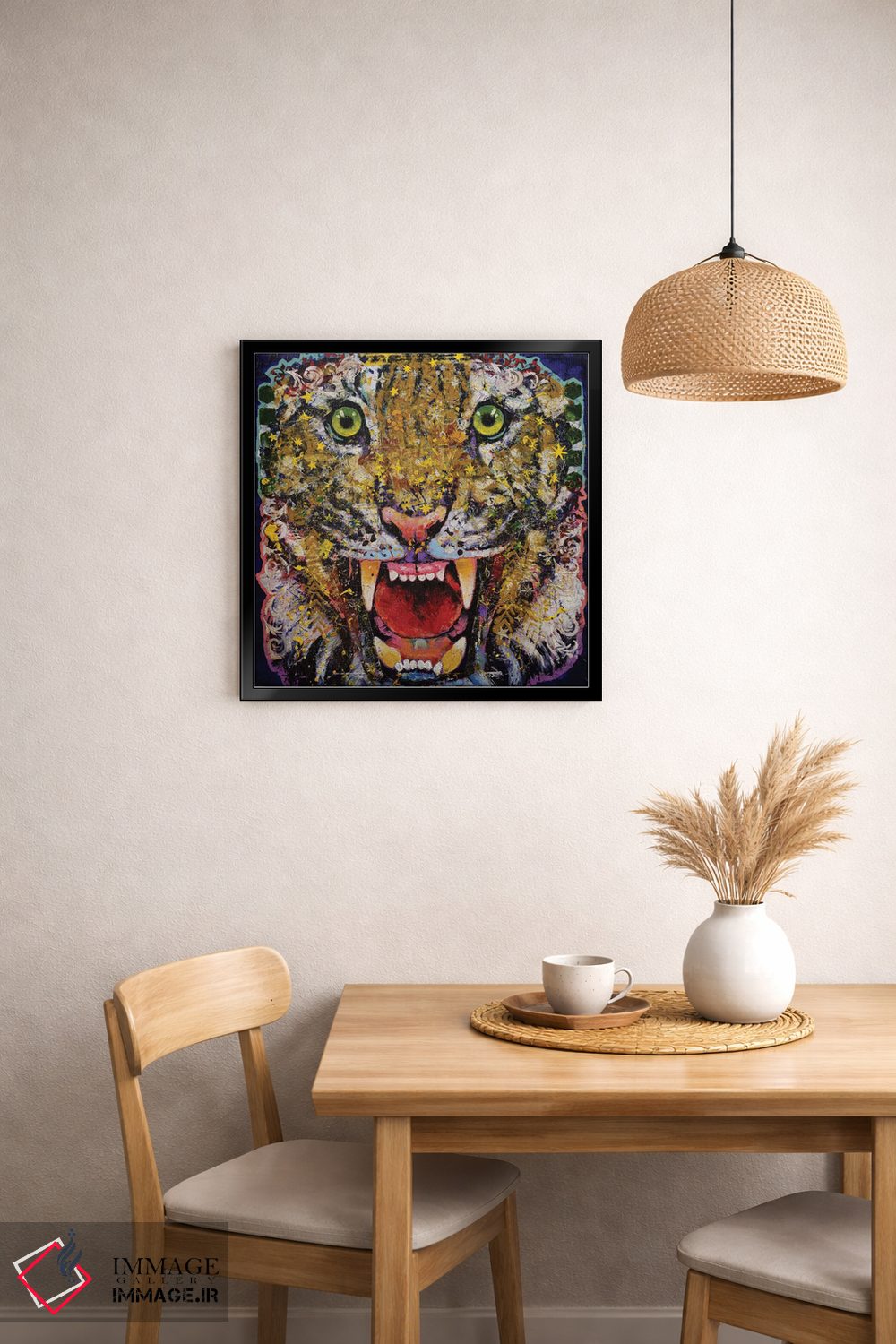 اگر میخواهید دیوار کمی سرزندگیِ محترمانه داشته باشد، «ببر رنگین» اثرِ «مایکل کریس» بدون کودکانه شدن، بازیگوش و خوشپرداخت میماند، برای فضاهای روستیک یا بوهو گزینهٔ مناسبیست. برای دیوار گالریوار هم گزینهٔ خوبیست.