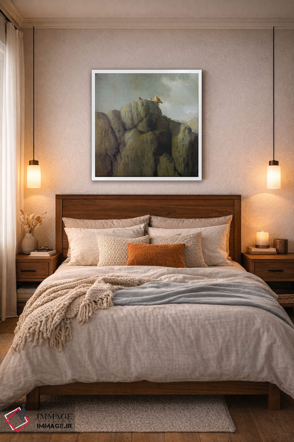 براساس پالت گرم اثر، قاب بلوط روشن (چوبی) پیشنهاد اول است و استخوانی ملایم مکمل. برای سفارشهای پروژهای با ابعاد و قابهای اختصاصی با ایماژ در تماس باشید.