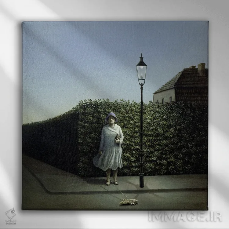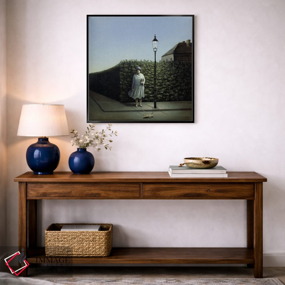 «زن با شبپره» اثرِ «مایکل سووا» ترکیببندی متعادل دارد و به دیوار وقار میدهد؛ بدون اینکه فضا را سنگین کند.