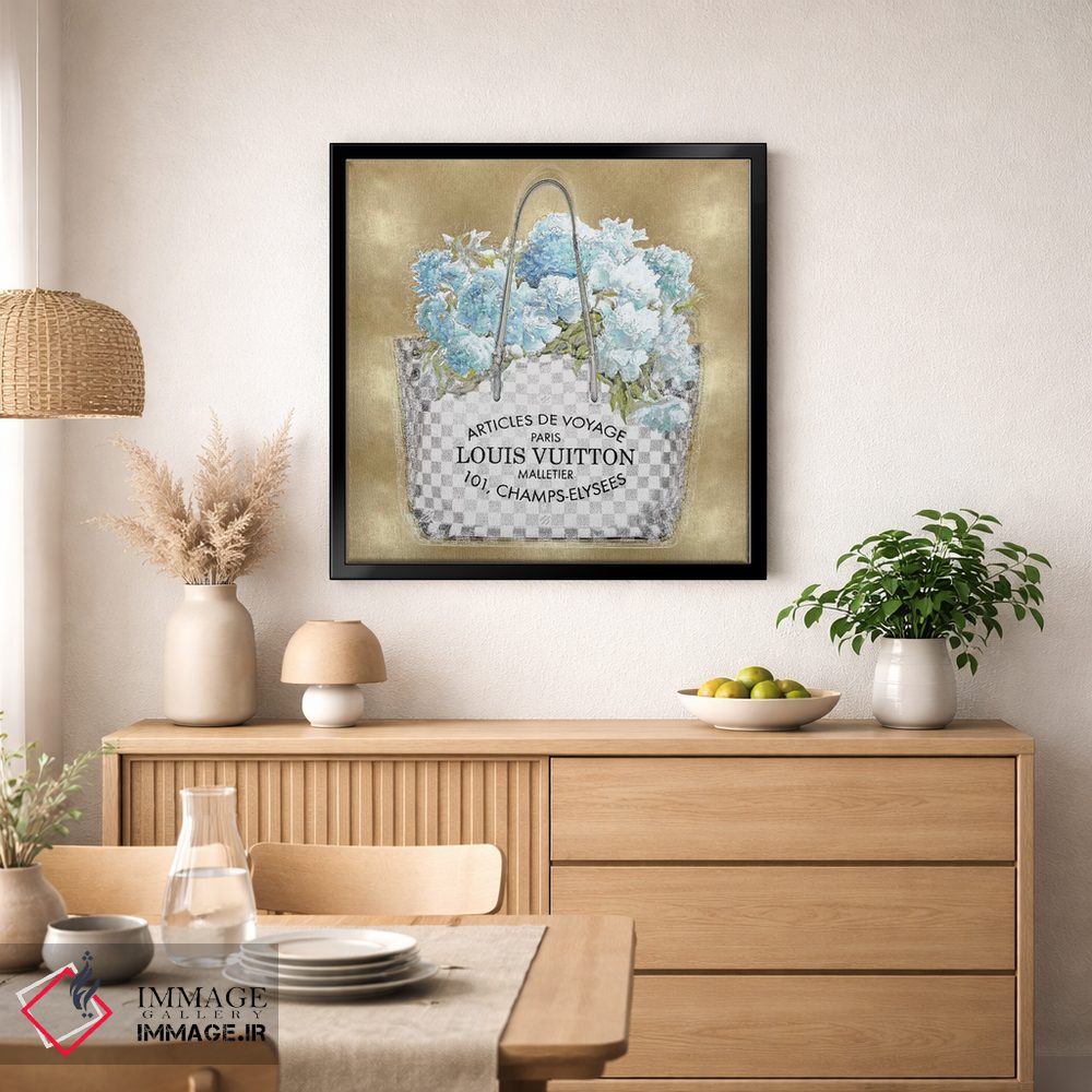 اگر دوست دارید دیوار روشنتر و آرامتر دیده شود، «دستهگل فیروزهای روی زمینه طلایی» اثرِ «مدلین بلیک» فضا را نرمتر و مهماننوازتر میکند، برای فضای غذاخوری گزینهٔ مناسبیست. فضا را شلوغ نمیکند؛ فقط لطیفترش میکند.