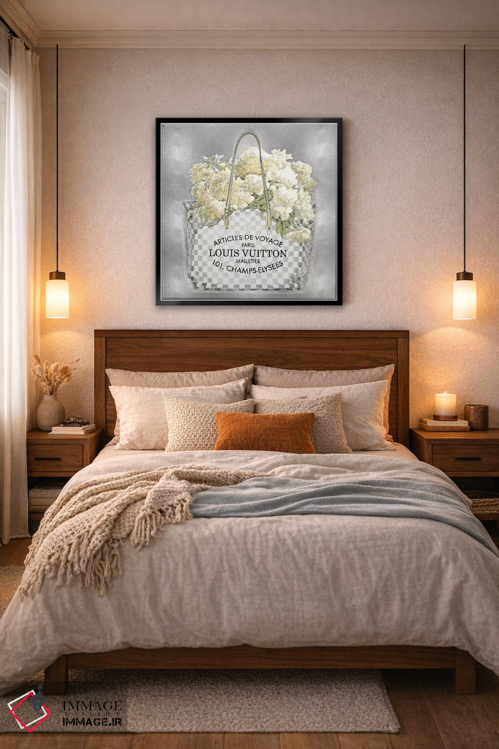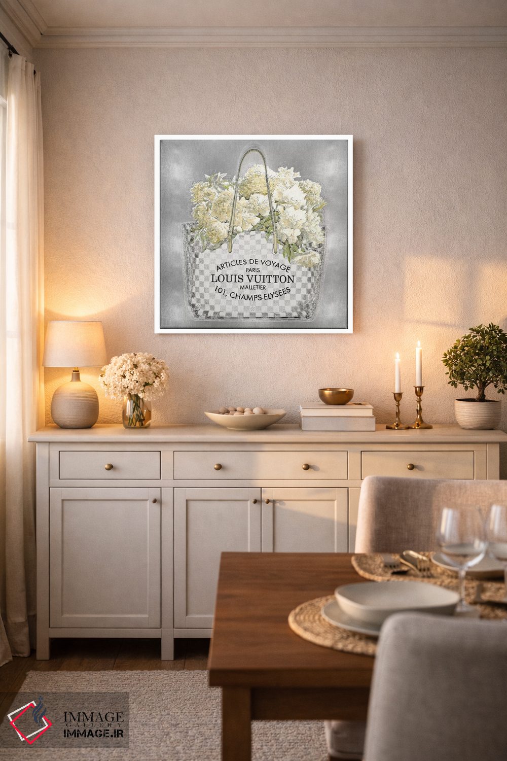 براساس پالت گرم اثر، قاب بلوط روشن (چوبی) پیشنهاد اول است و استخوانی ملایم مکمل. برای سفارشهای پروژهای با ابعاد و قابهای اختصاصی با ایماژ در تماس باشید.
