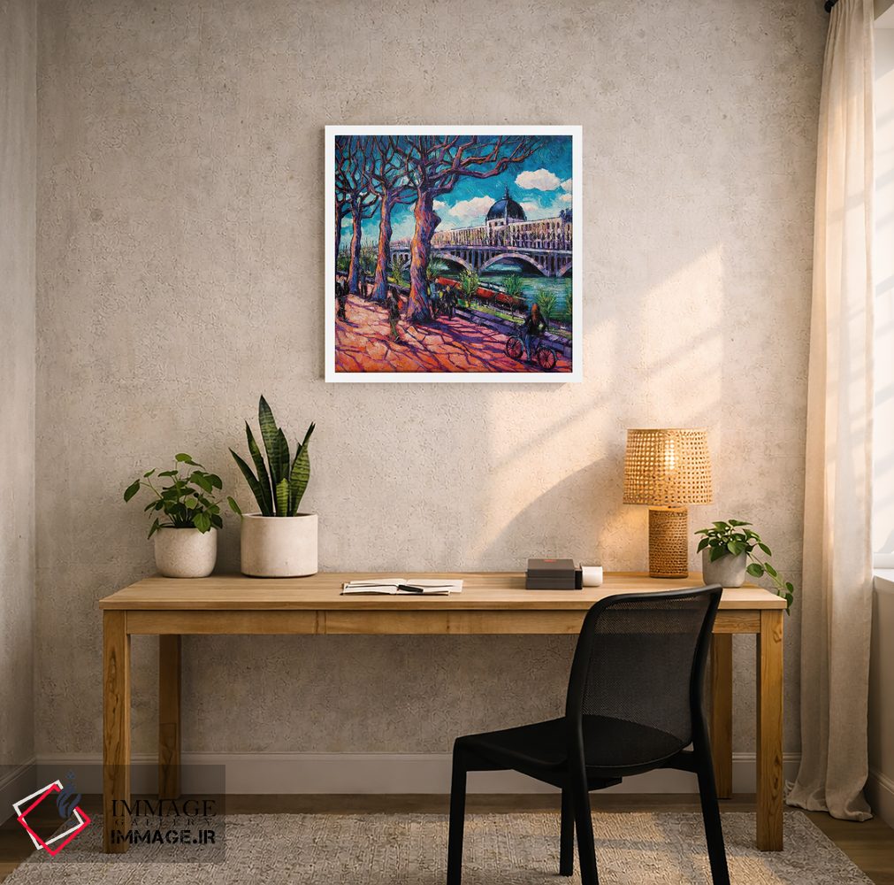 «پیادهروی در کنار رون (رودخانه فرانسه)» اثرِ «مونا ادولسکو» ترکیببندی متعادل دارد و به دیوار وقار میدهد؛ بدون اینکه فضا را سنگین کند.