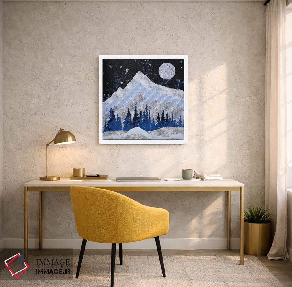 براساس پالت سرد اثر، قاب سفید مات (فریم باریک) پیشنهاد اول است و نقرهای برسخورده (متالیک) مکمل. برای سفارشهای پروژهای با ابعاد و قابهای اختصاصی با ایماژ در تماس باشید.
