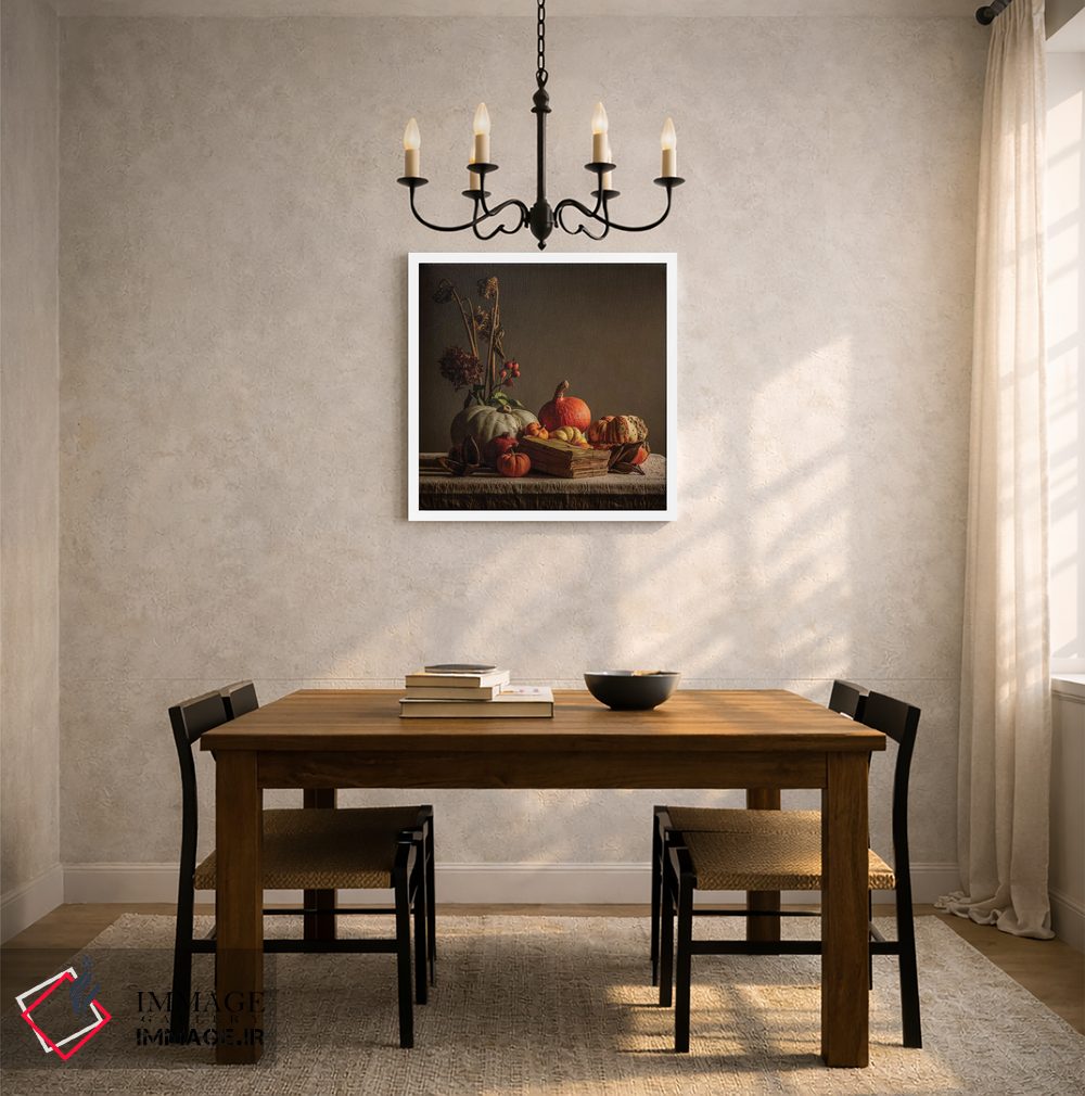 براساس پالت گرم اثر، قاب بلوط روشن (چوبی) پیشنهاد اول است و استخوانی ملایم مکمل. برای سفارشهای پروژهای با ابعاد و قابهای اختصاصی با ایماژ در تماس باشید.