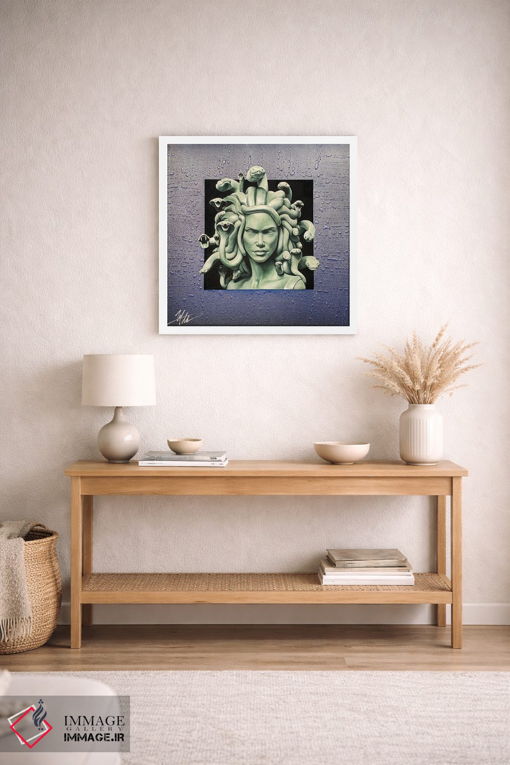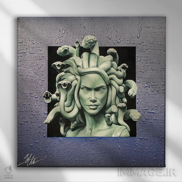 «مدوسا (شخصیت اسطورهای یونان)» اثرِ «مایکل گلدزوایگ» با حالوهوای دکور معاصر و موضوعِ این اثر، برای نشیمنهای امروزی و چیدمانهای ساده انتخابی دقیق است.