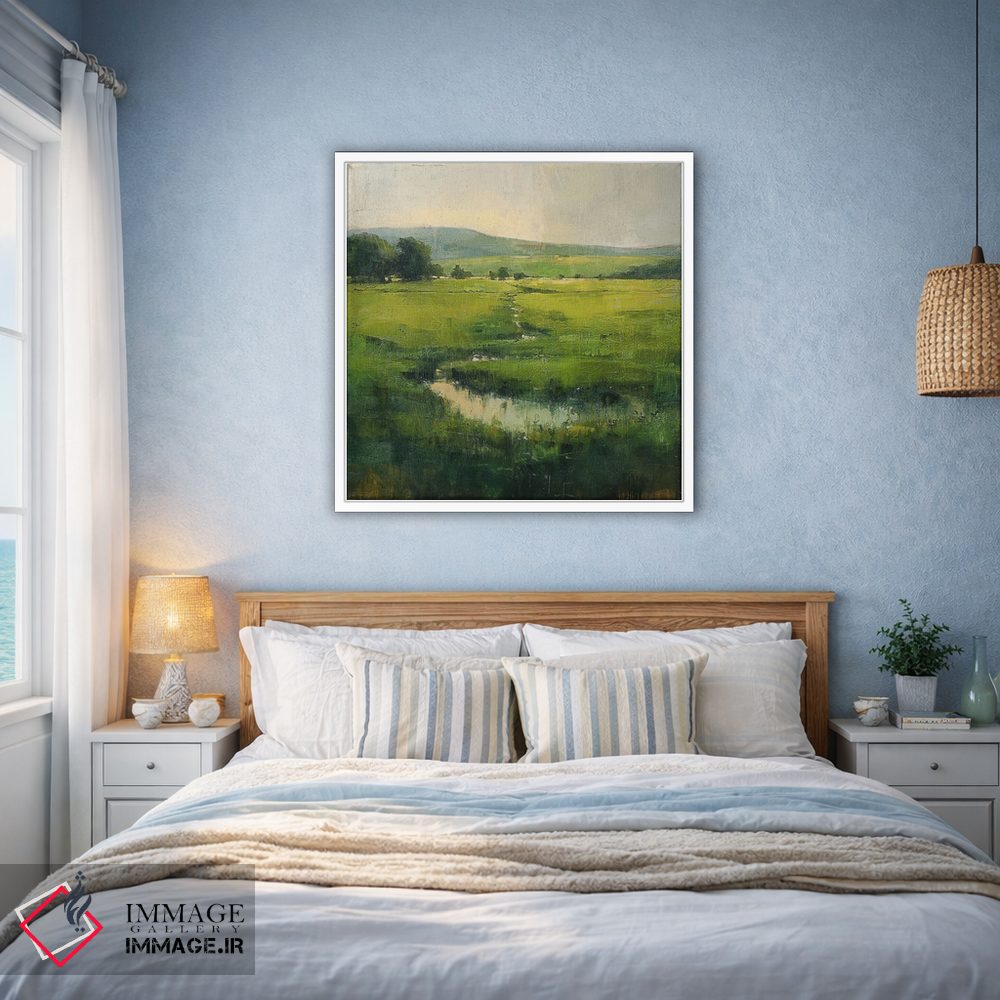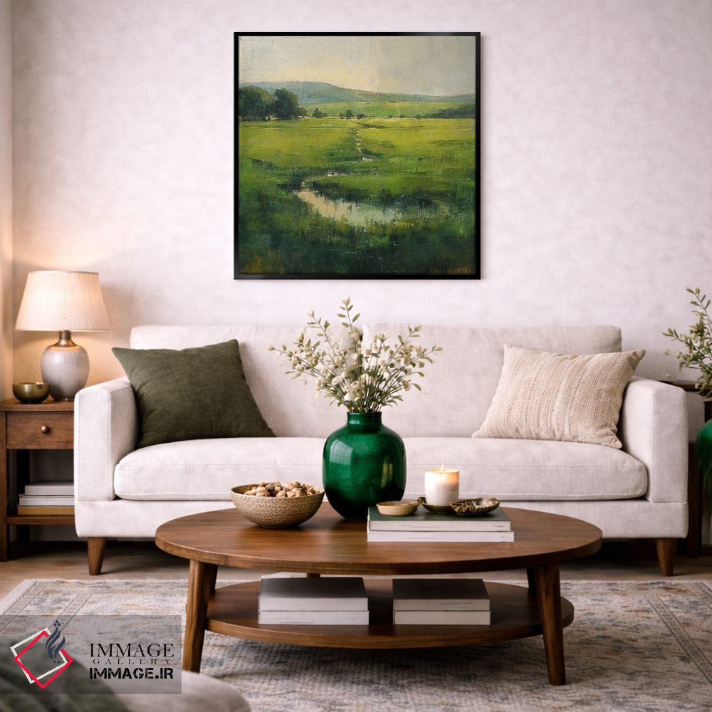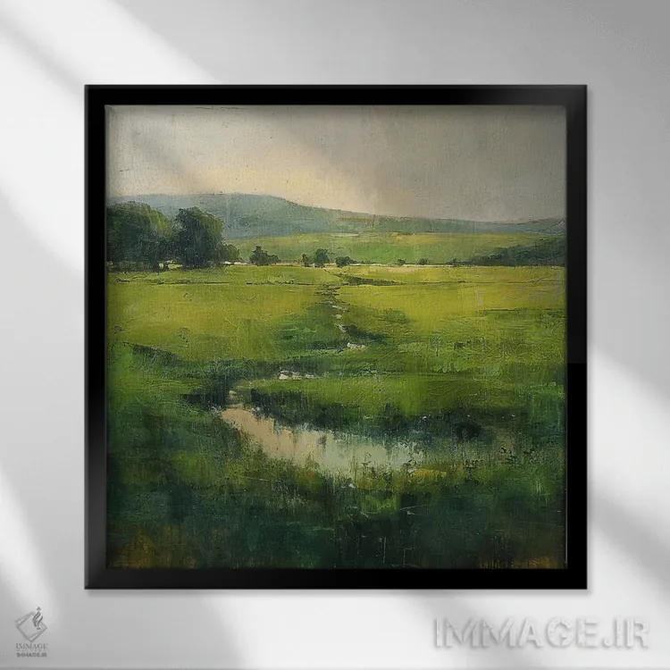 «دشتهای سبز شهرستان مایو (ایرلند)» اثرِ «کانر مکگوایر» یک قاب دکوراتیوِ گرم و دلنشین است؛ این اثر در اجرای پرداختِ هنری، فضا را نرمتر و صمیمیتر نشان میدهد.
