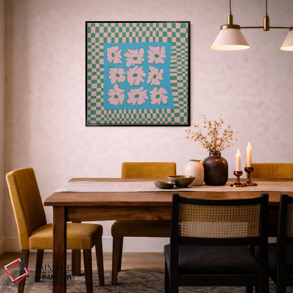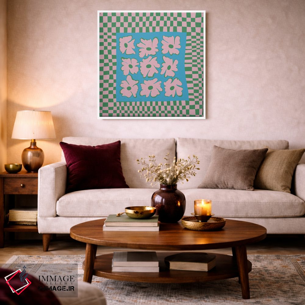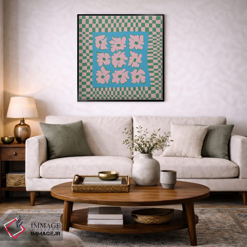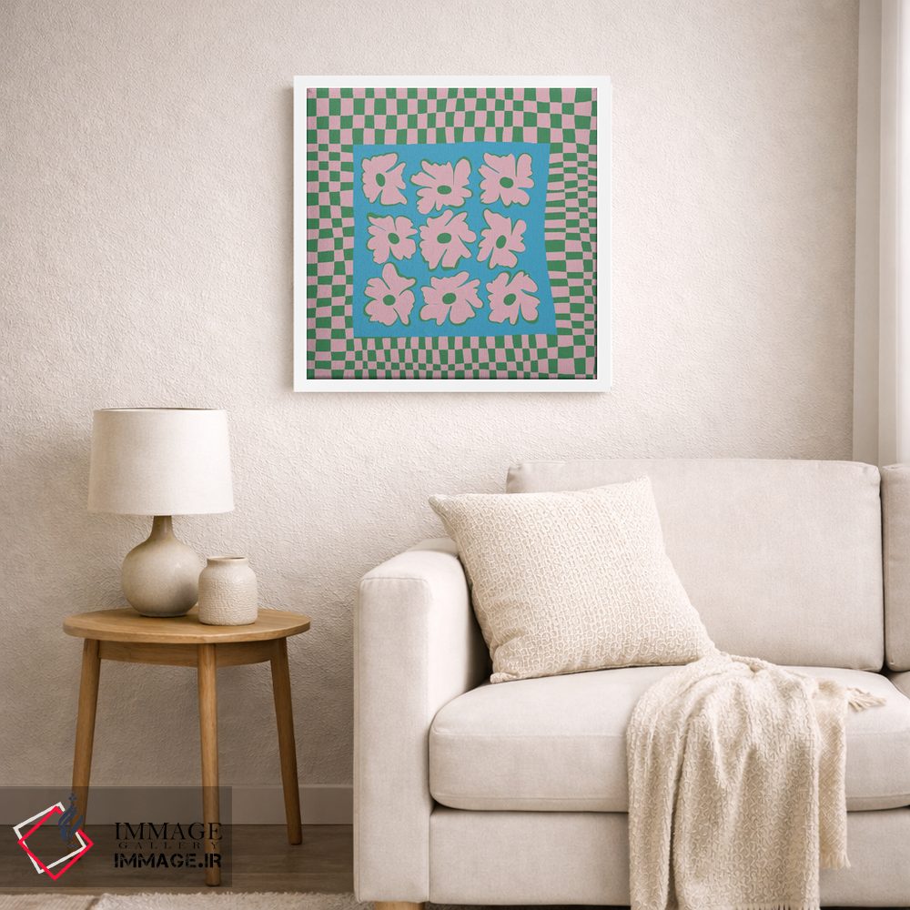 «"صفحه شطرنجی طبیعت با رنگهای ملایم"» اثرِ «استودیو هنری میهو» با حالوهوای تزئینیِ این اثر، فضا را روشن و مرتب میکند؛ مناسب نشیمنهای روشن و چیدمانهای مدرن.