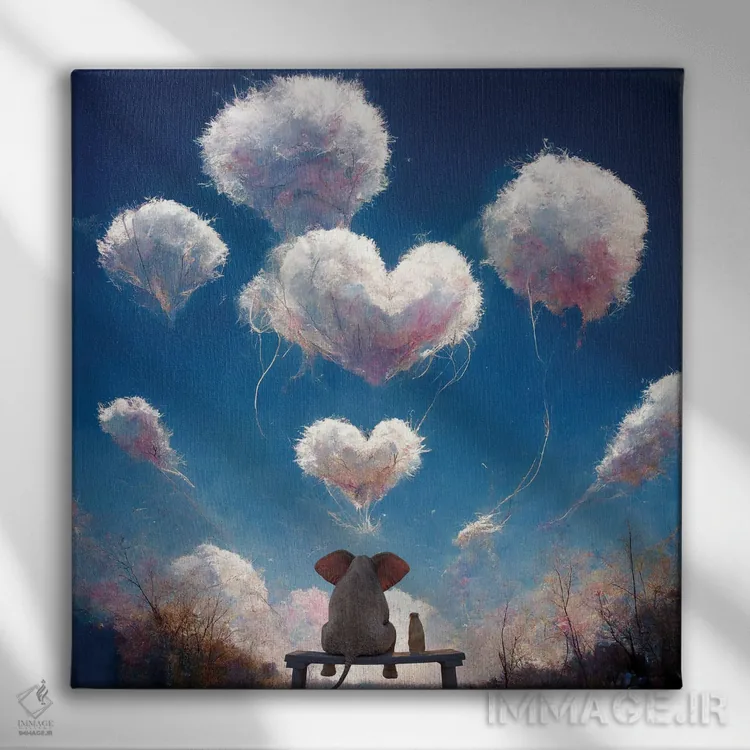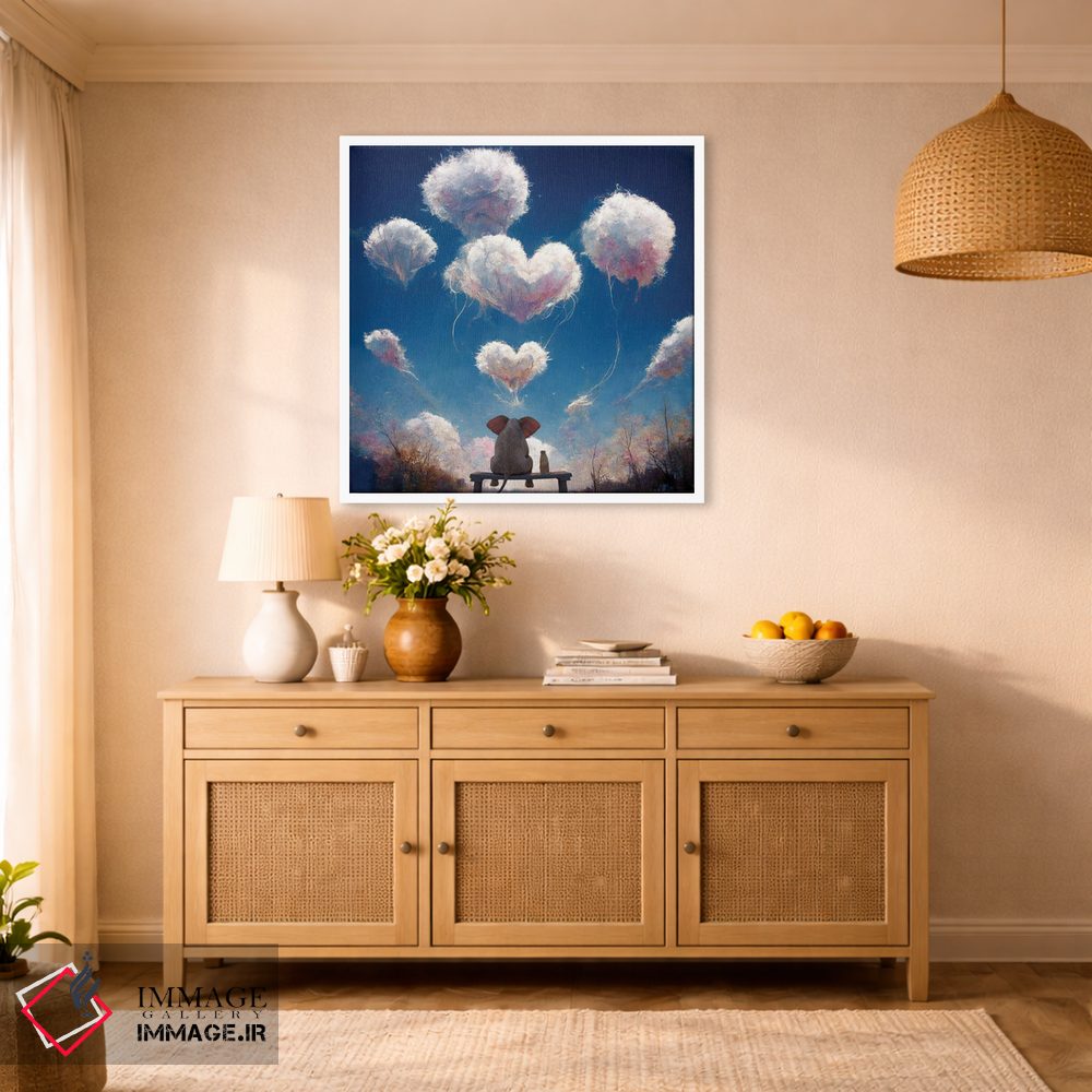 این تابلو با عنوان «فیل و سگ به ابرهای پفکرده نگاه میکنند» اثرِ «مایک کیف»، برای دفتر کار و اتاق مطالعه انتخابی عالی است.