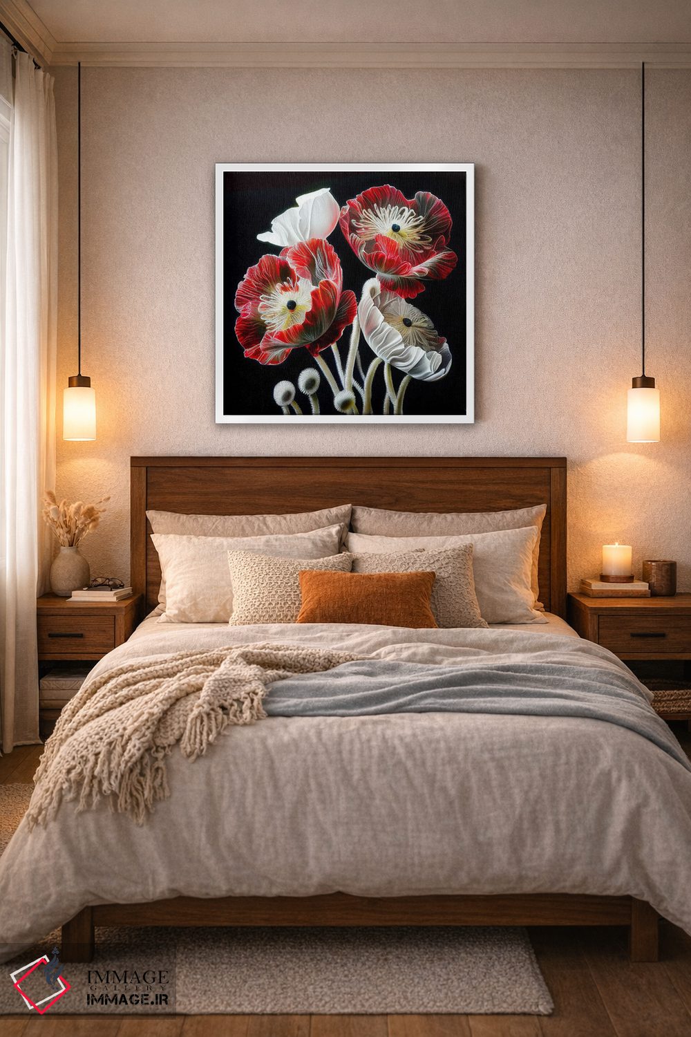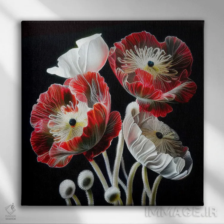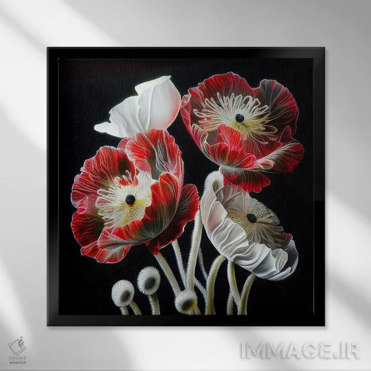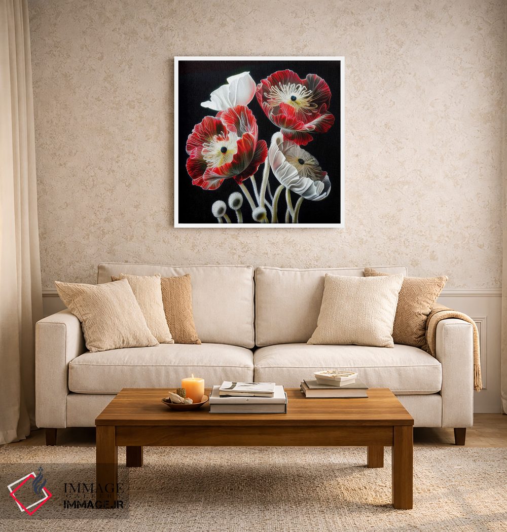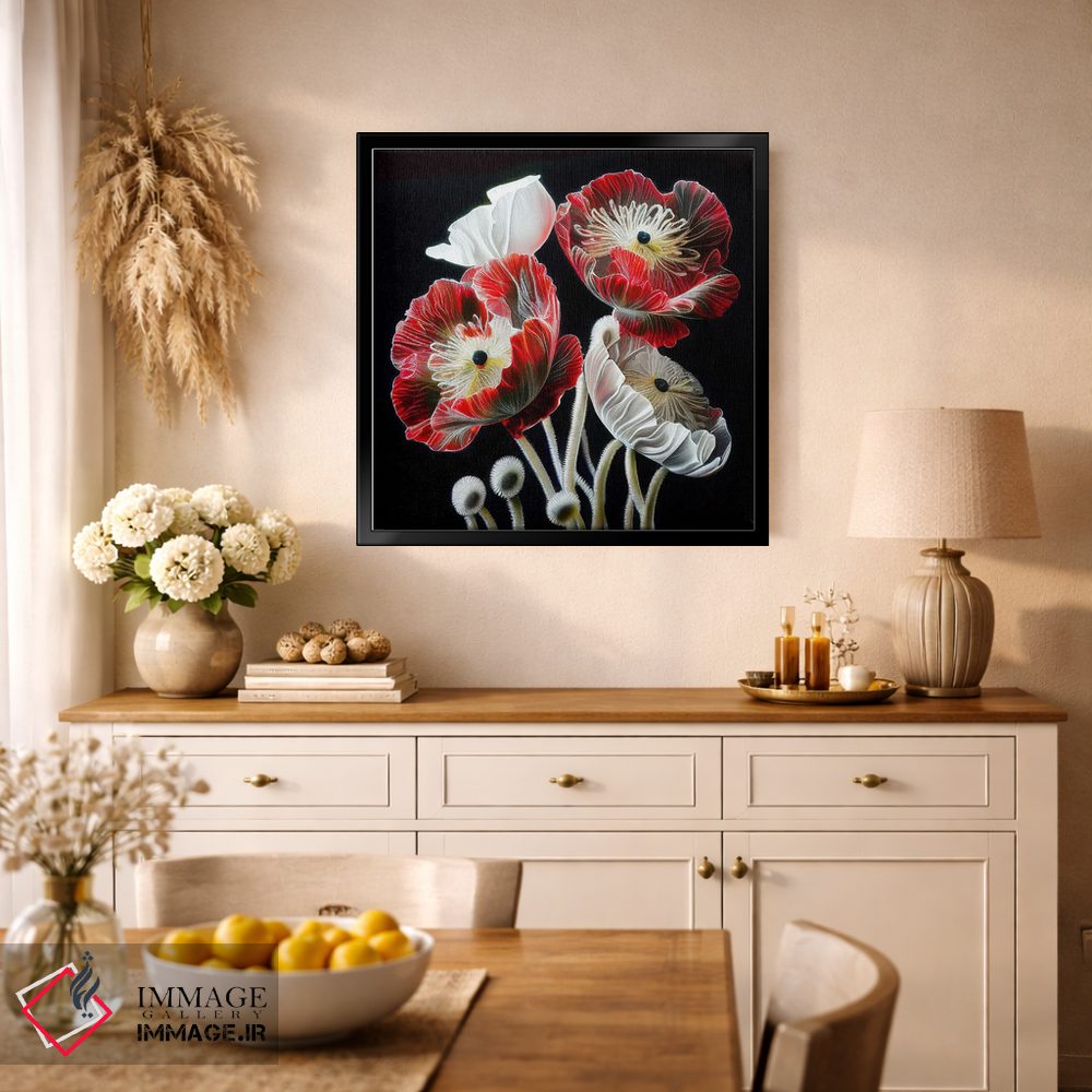 برای فضاهایی که به لطافت نیاز دارند، «گل شقایق قرمز روی زمینه سیاه» اثرِ «مایک کیف» چیدمان را از خشکی بیرون میآورد؛ برای راهروهای مینیمال انتخابی خوشسلیقه است. با قاب روشن یا چوبی، حس طبیعیتری پیدا میکند.