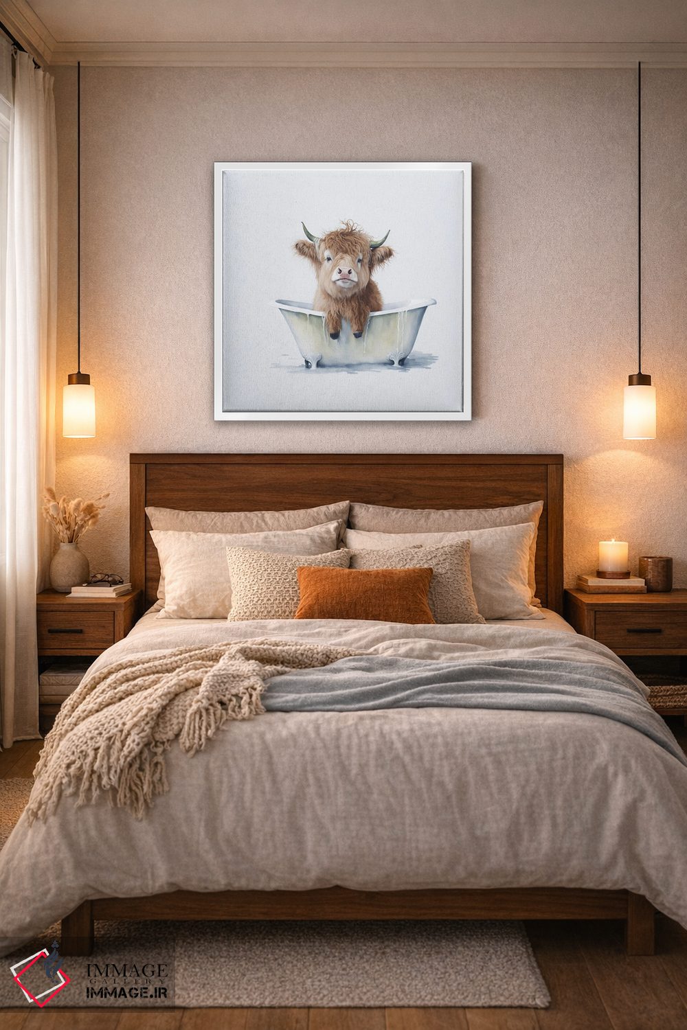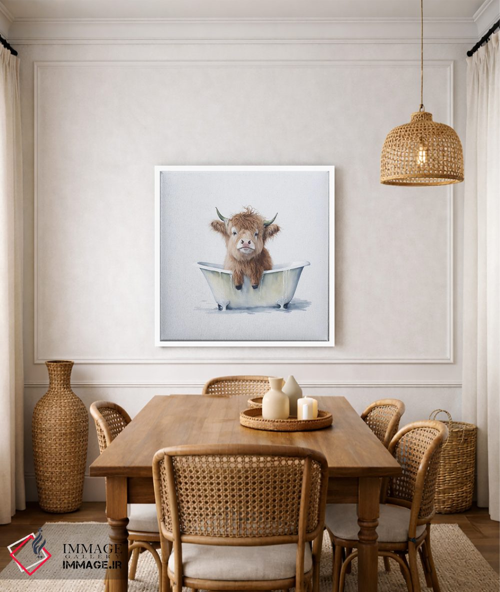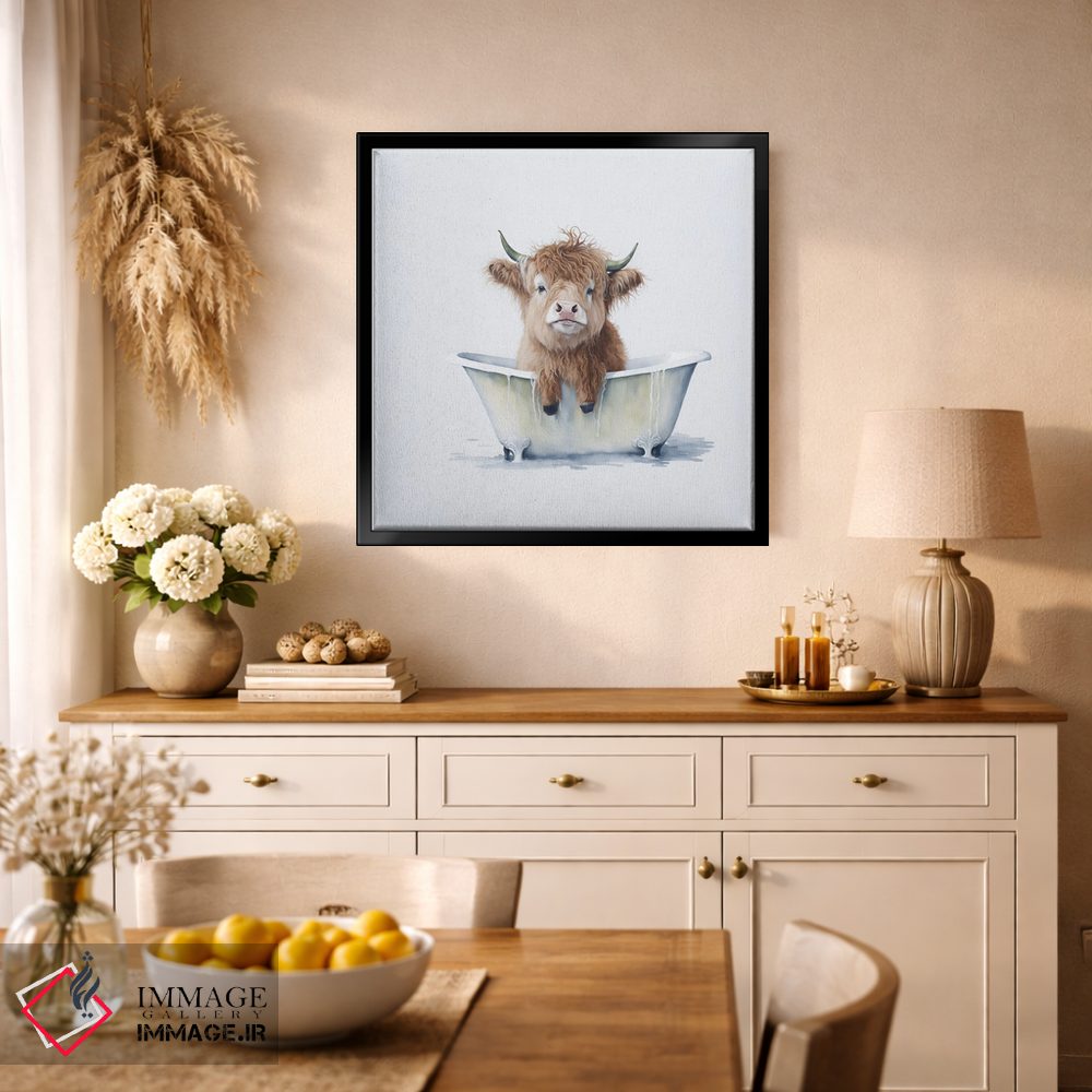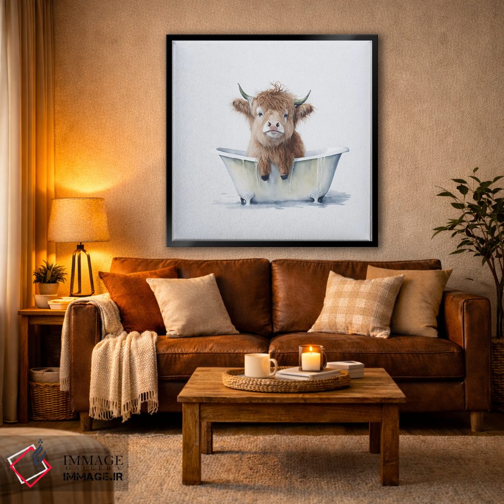 اگر به آثار حیوانات علاقه دارید، «شستن گاو هایلند ۳» اثرِ «مایک کیف» مثل یک امضای بامزه اما متین عمل میکند، برای نشیمنهای خانوادگی گزینهٔ مناسبیست. با نورپردازی نقطهای، جذابتر هم میشود.