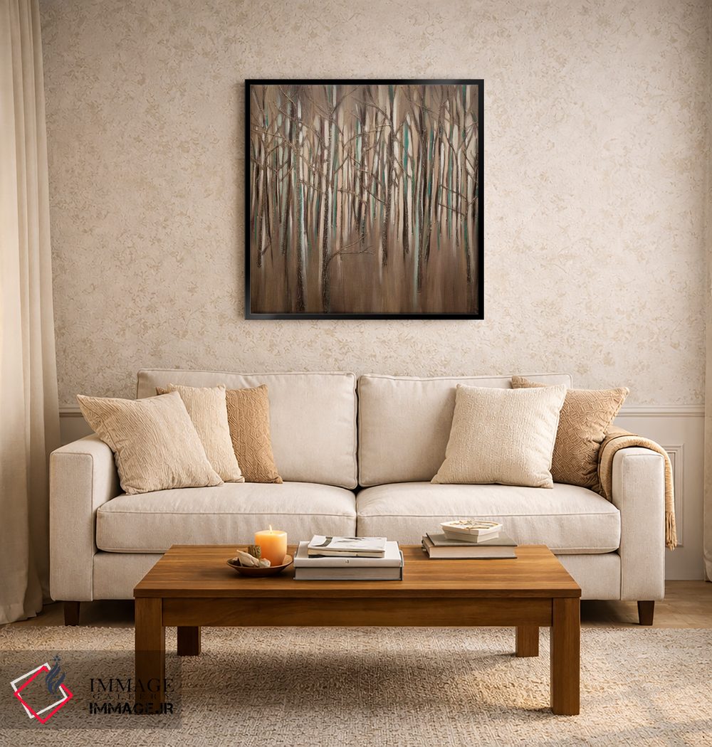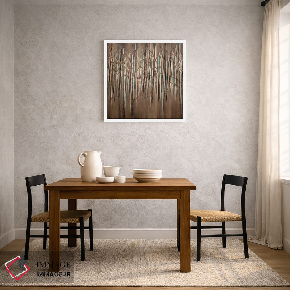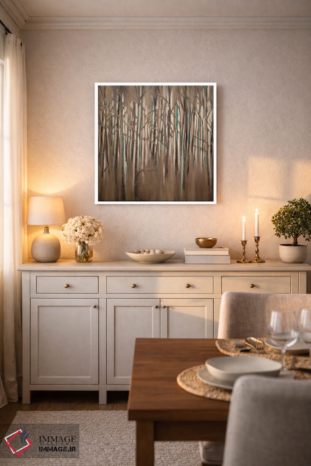 براساس پالت گرم اثر، قاب بلوط روشن (چوبی) پیشنهاد اول است و استخوانی ملایم مکمل. برای سفارشهای پروژهای با ابعاد و قابهای اختصاصی با ایماژ در تماس باشید.