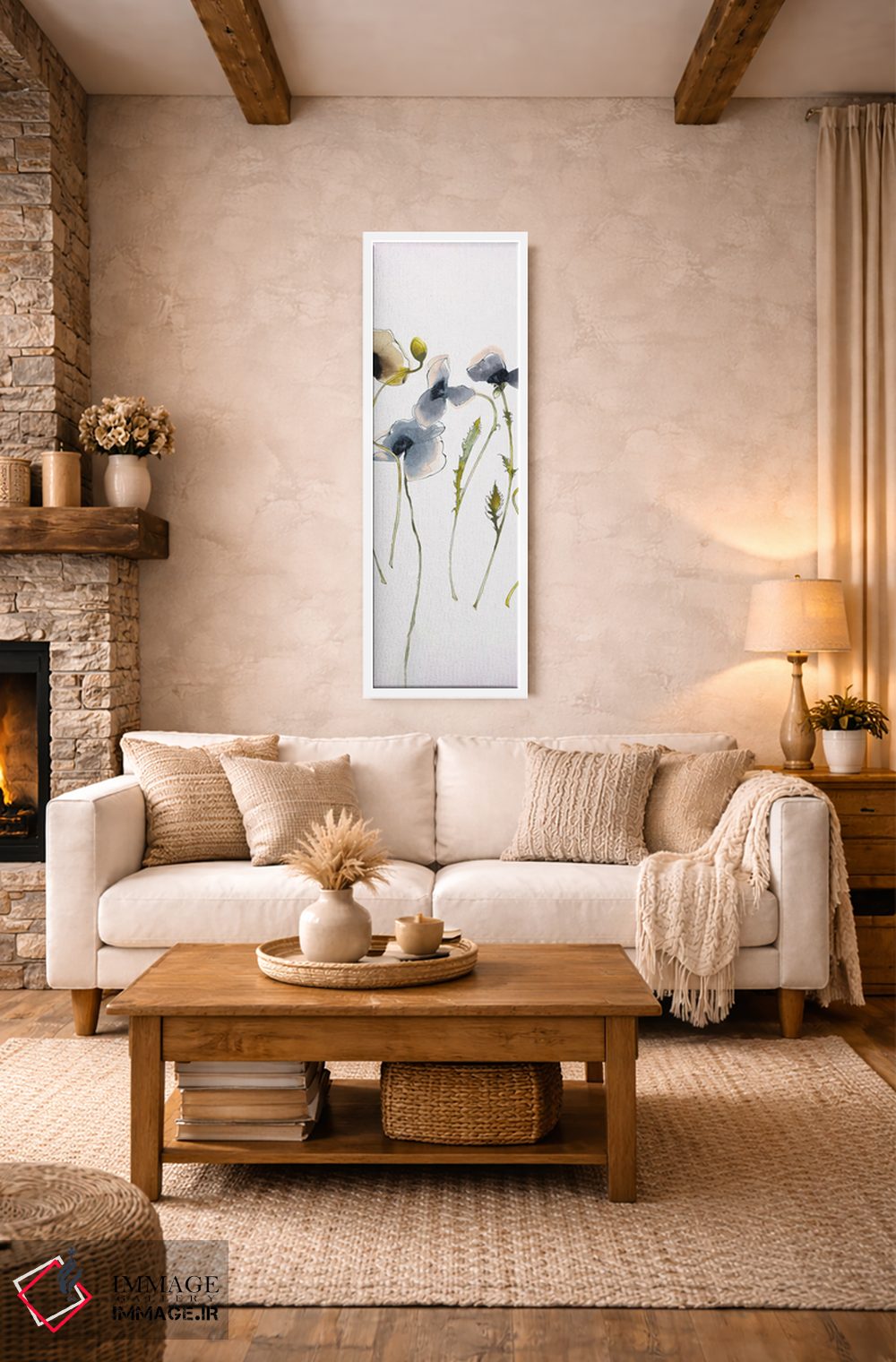 براساس پالت ترکیبی اثر، قاب بلوط روشن (چوبی) پیشنهاد اول است و استخوانی ملایم مکمل. برای سفارشهای پروژهای با ابعاد و قابهای اختصاصی با ایماژ در تماس باشید.