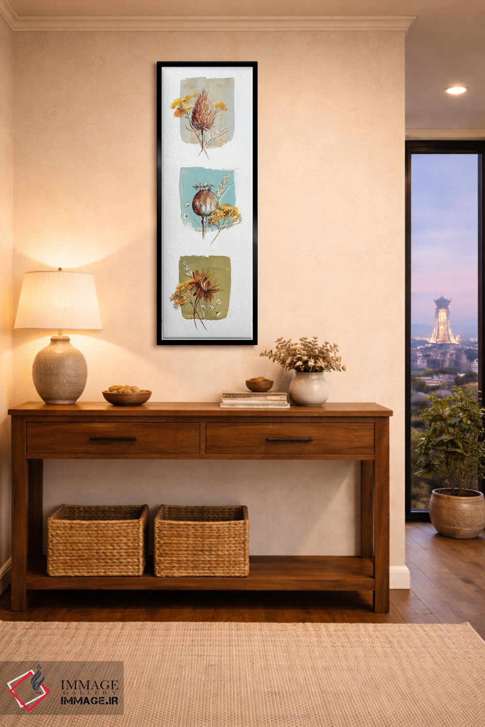براساس پالت گرم اثر، قاب تیک گرم (چوبی) پیشنهاد اول است و مشکی مات (فریم متوسط) مکمل. برای سفارشهای پروژهای با ابعاد و قابهای اختصاصی با ایماژ در تماس باشید.
