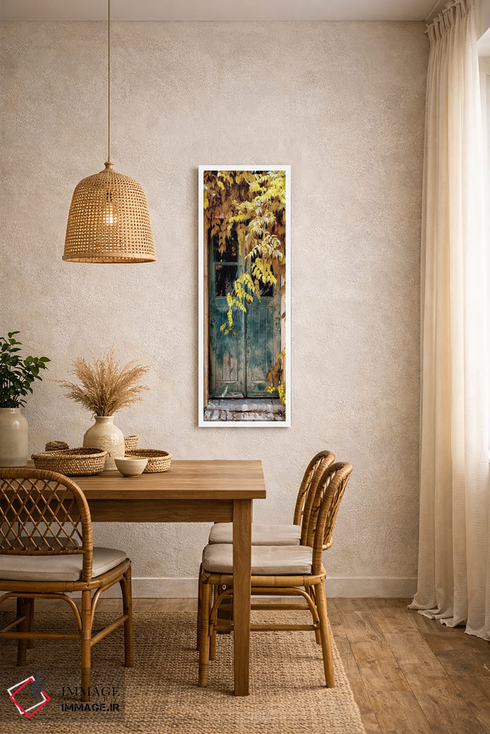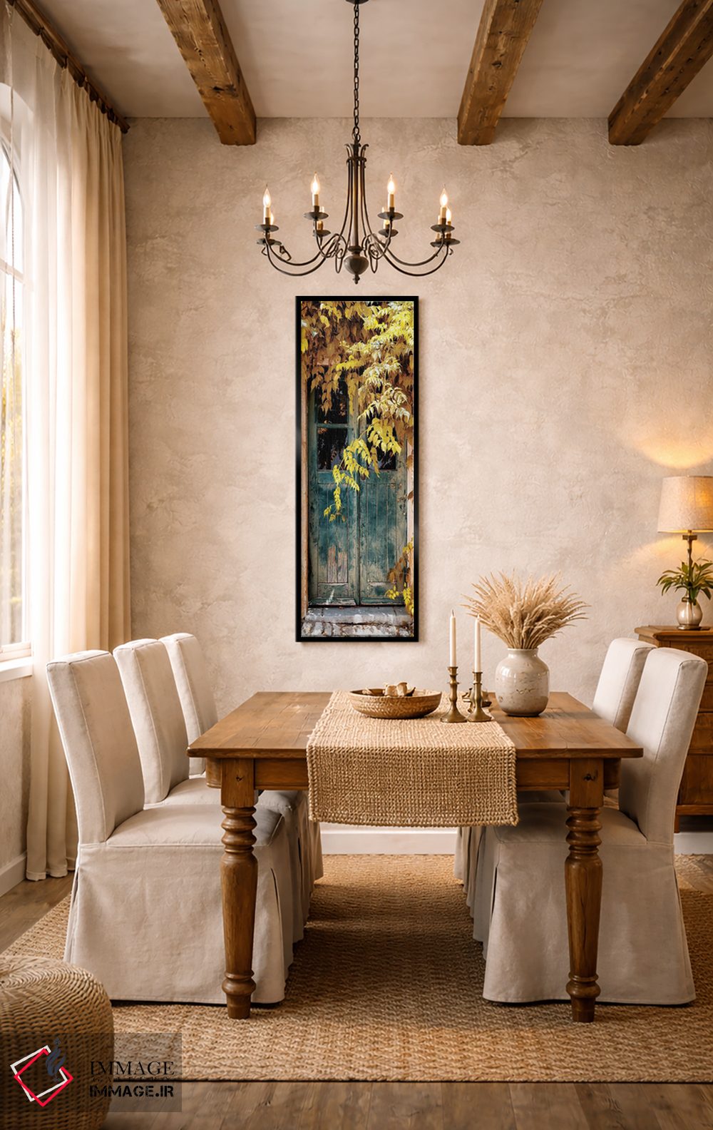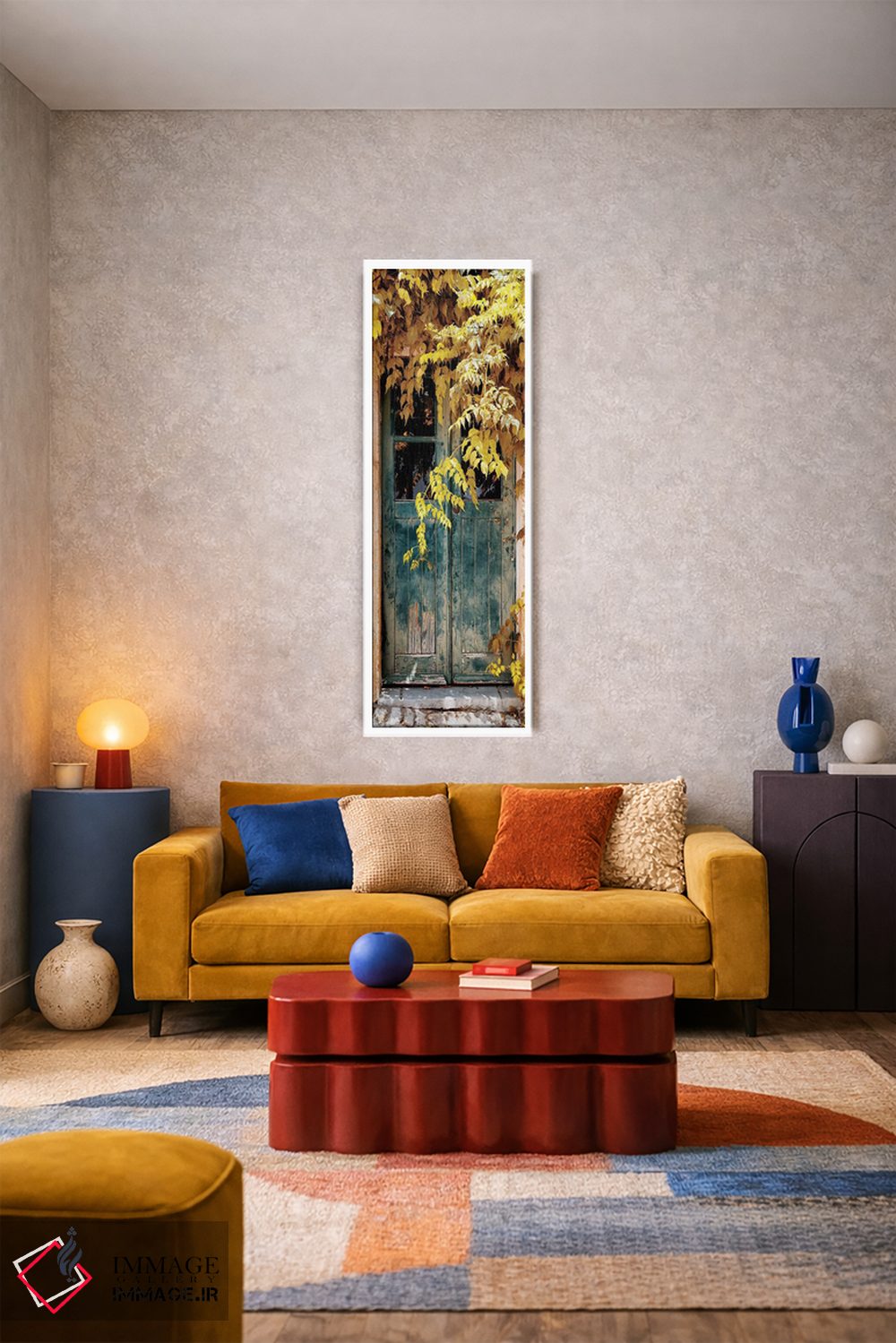 این تابلو با عنوان «"در قدیمی با رنگهای پاییزی II"» اثرِ «فیلیپ هوگونار» به دیوار، شخصیت و جهت میدهد؛ برای دیوارهای گالریوار و ترکیب چند اثر پیشنهاد میشود. با مبلمان خنثی، تضاد دلنشینی میسازد.
