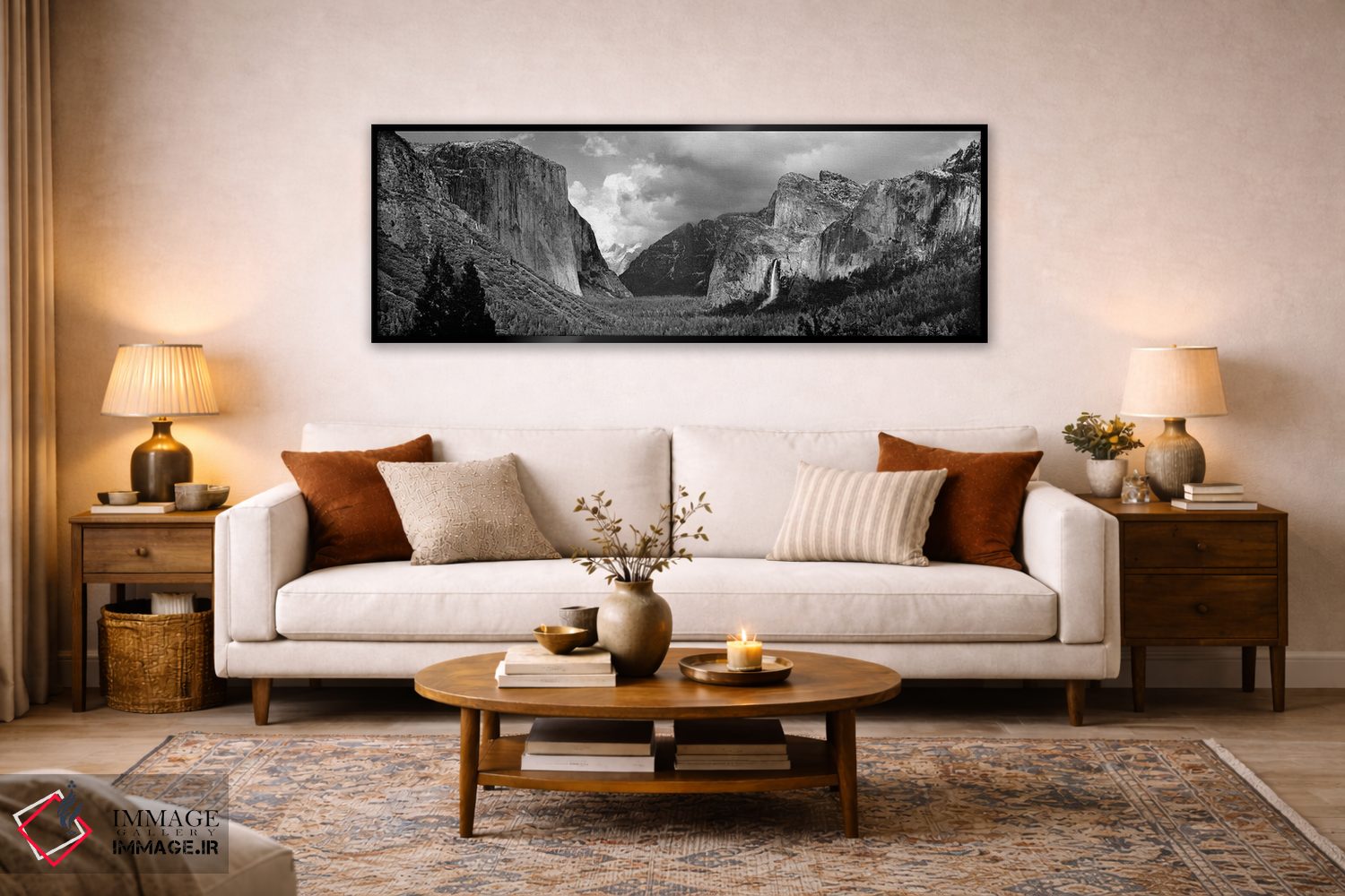این تابلو اثرِ «پانورامیک ایمجز (استودیو عکاسی عریض)» با حس سیاهوسفید، برای راهروهای شیک و دیوارهای کمجزئیات انتخاب مناسبی است؛ موضوعِ این اثر هم فضا را مرتبتر نشان میدهد.