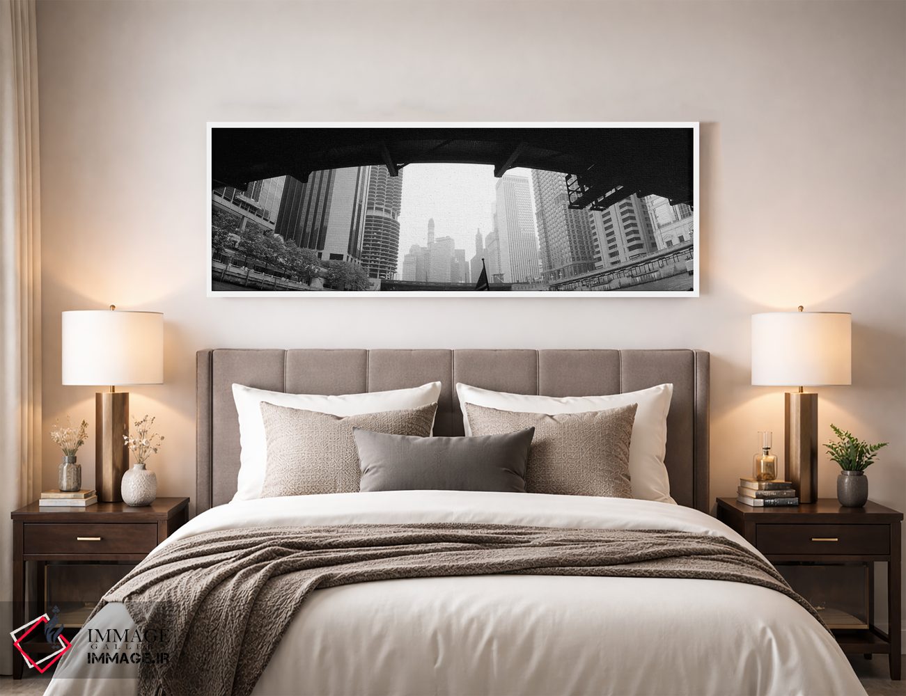 در «Chicago، Illinois، USA، نمای زاویه پایین از ساختمانها، شیکاگو، ایلینوی، آمریکا»، اثرِ «پانورامیک ایمجز (استودیو عکاسی عریض)» این اثر را با زبان سیاهوسفید ارائه میکند؛ برای دکورهای کلاسیک—مدرن یک انتخاب مطمئن و هماهنگپذیر است.