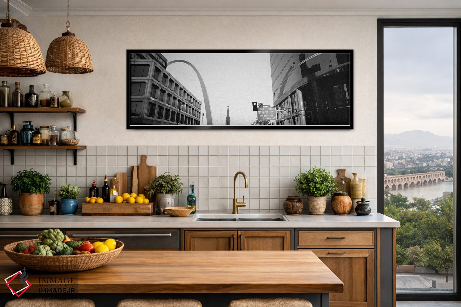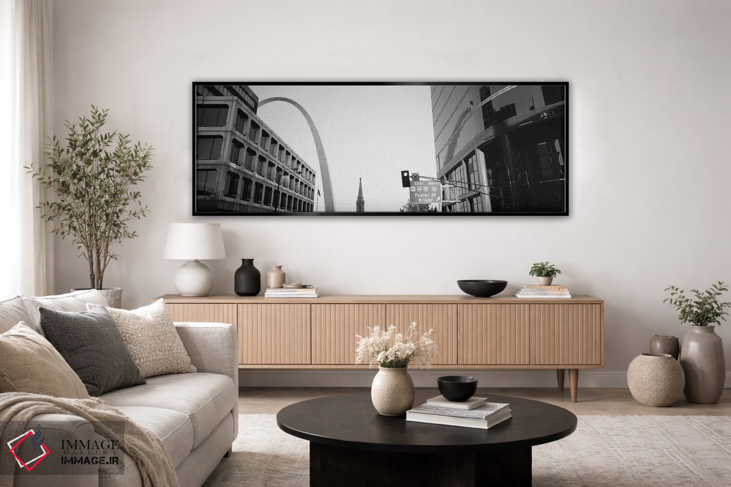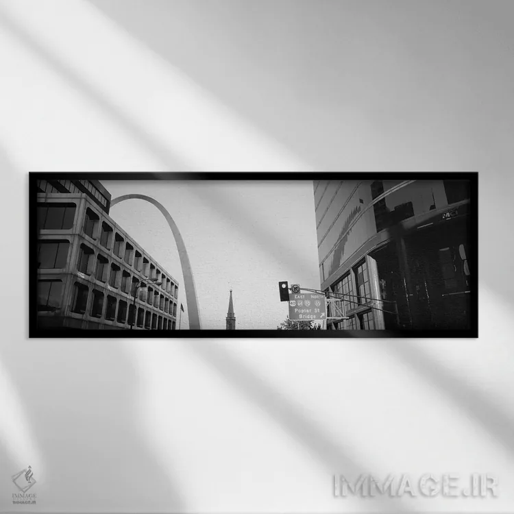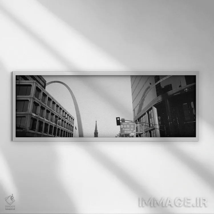 در «St. Louis، Missouri، USA، نمای زاویه پایین از خیابان چهارم به صورت سیاه و سفید، سنت لوئیس، میسوری، آمریکا»، اثرِ «پانورامیک ایمجز (استودیو عکاسی عریض)» این اثر را با زبان سیاهوسفید ارائه میکند؛ برای دکورهای کلاسیک—مدرن یک انتخاب مطمئن و هماهنگپذیر است.