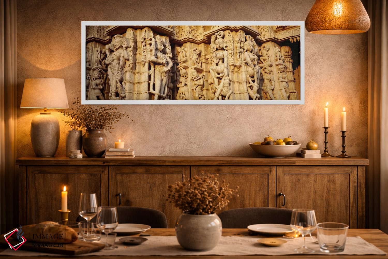 براساس پالت گرم اثر، قاب تیک گرم (چوبی) پیشنهاد اول است و مشکی مات (فریم متوسط) مکمل. برای سفارشهای پروژهای با ابعاد و قابهای اختصاصی با ایماژ در تماس باشید.