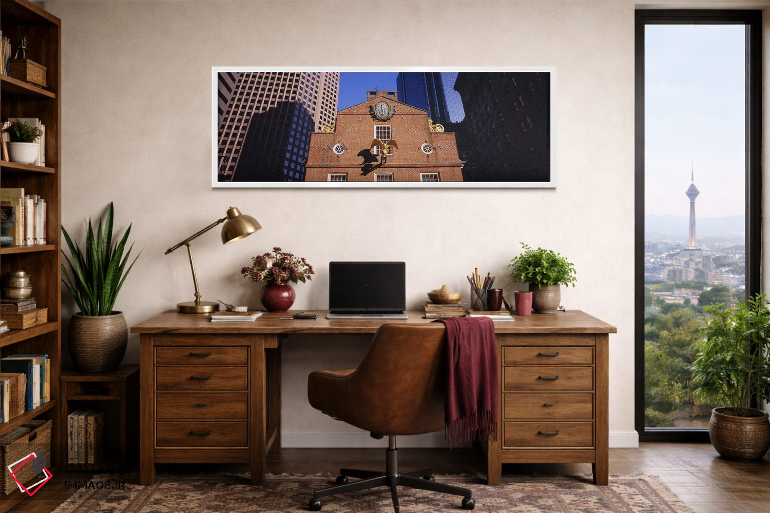 «Old State House، Freedom Trail، Boston، Massachusetts، USA، نمای زاویه پایین از عقاب طلایی در بیرون یک ساختمان، اولد استیت هاوس، مسیر آزادی، بوستون، ماساچوست، آمریکا» اثرِ «پانورامیک ایمجز (استودیو عکاسی عریض)» بازیِ دقیقِ خط و هندسه است؛ پرسپکتیو و خطوط را به مرکز توجه تبدیل کند؛ برای استودیوهای طراحی انتخابی خوشسلیقه است. جزئیاتش از نزدیک هم خواناست و خوشپرداخت.