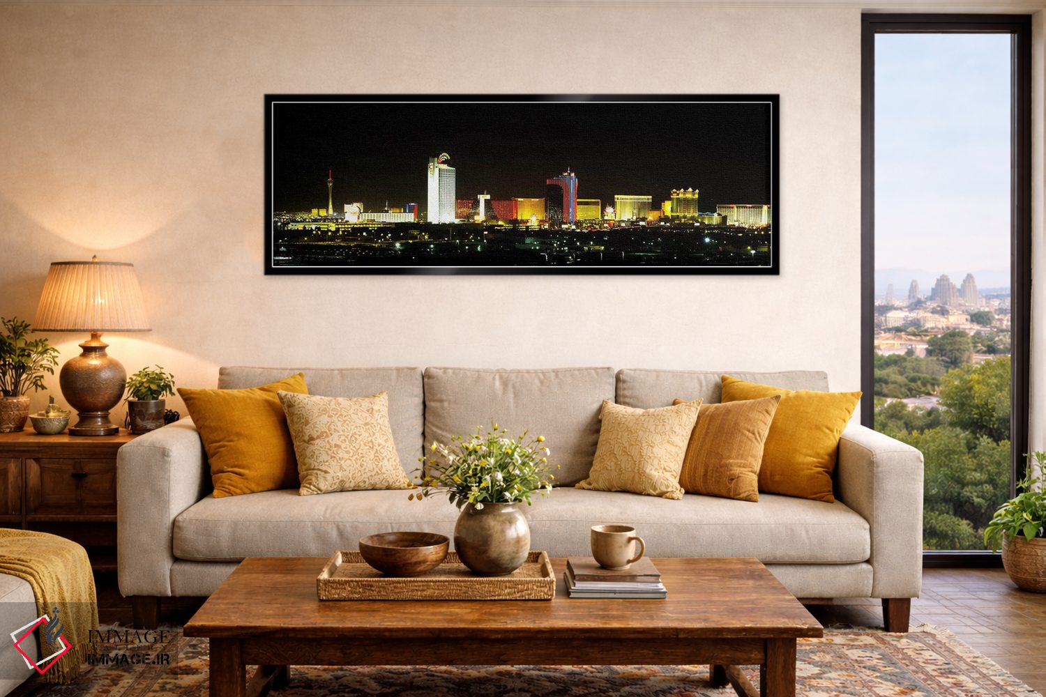 «Las Vegas، Nevada، USA، ساختمانهای نورپردازیشده شبانه در شهر—لاس وگاس، نوادا، آمریکا» اثرِ «پانورامیک ایمجز (استودیو عکاسی عریض)» میتواند ریتم فضا را منظم کند؛ برای کنار کتابخانه یا میز کار پیشنهاد میشود. هم از دور چشمگیر است و هم از نزدیک پرداخت دارد.