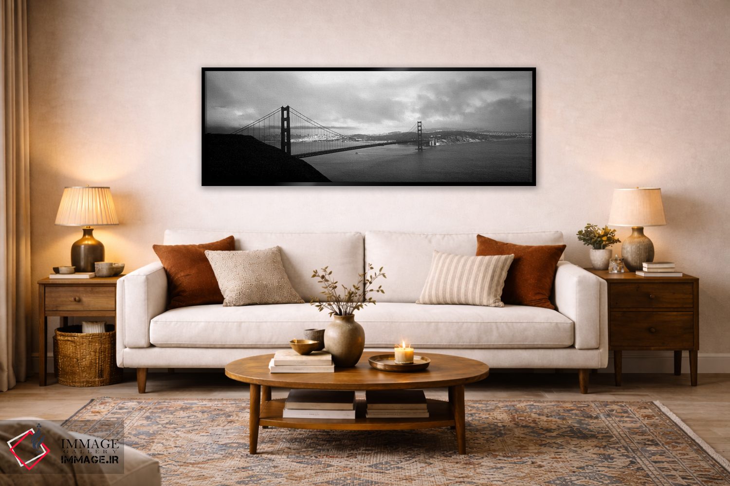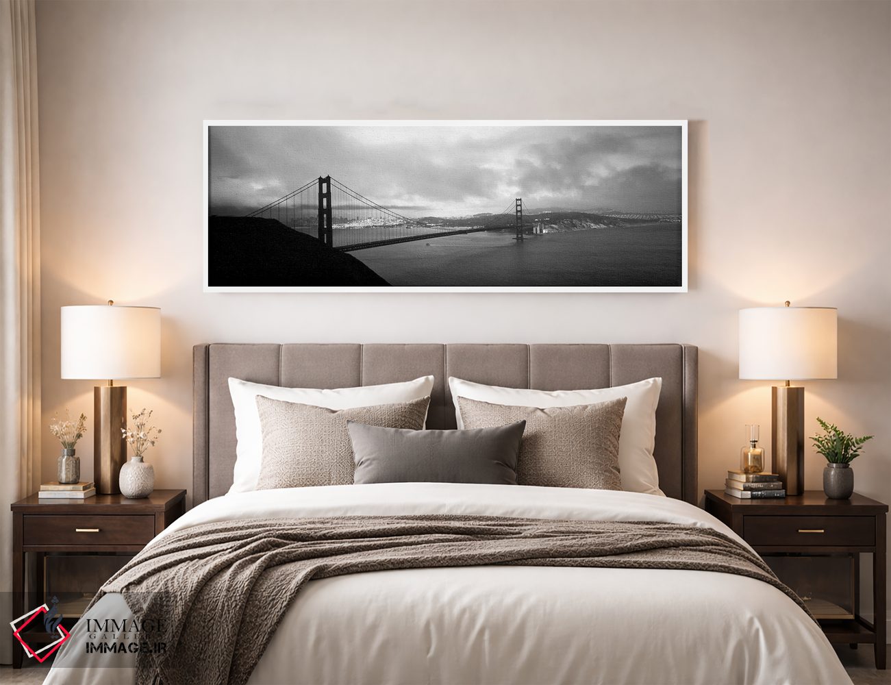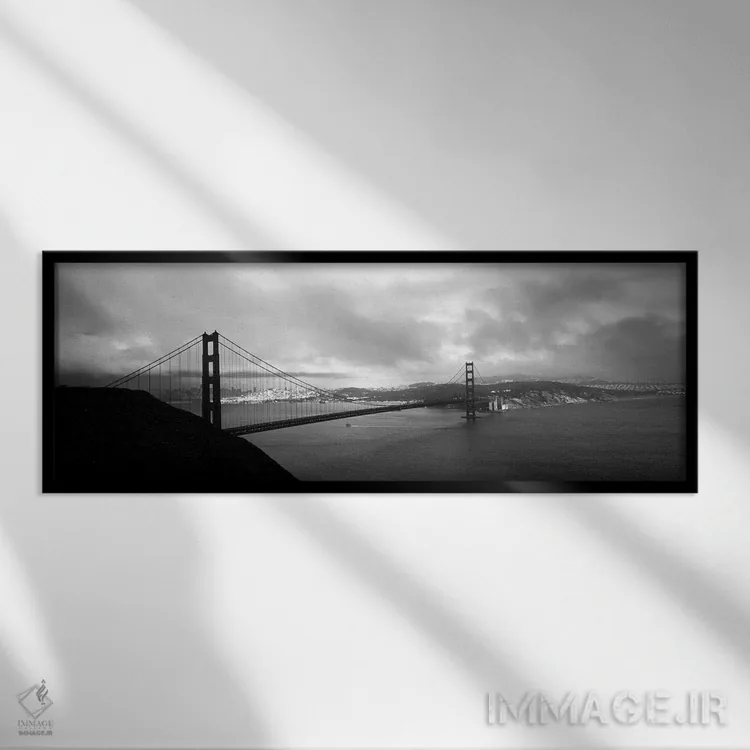 «Golden Gate Bridge، San Francisco، California، USA، نمای بالا از پلی بر فراز دریا، پل گلدن گیت، سانفرانسیسکو، کالیفرنیا، آمریکا» اثرِ «پانورامیک ایمجز (استودیو عکاسی عریض)» در فضای عکاسی سیاهوسفید، روی نور و کنتراست تکیه میکند؛ موضوعِ این اثر برای دکورهای مینیمال عالی است.